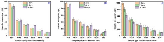 Composites elongation at break, ε (%), as a function of acetic acid concentration and immersion time: (a) 10% acetic acid in solution, (b) 20% acetic acid in solution, (c) 30% acetic acid in solution.