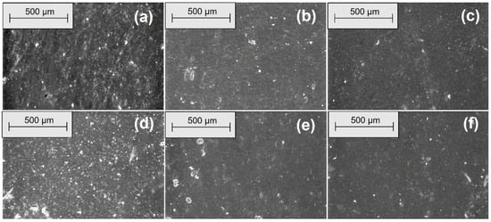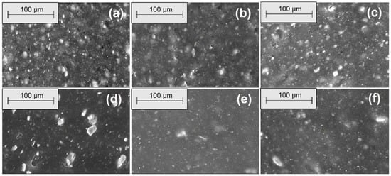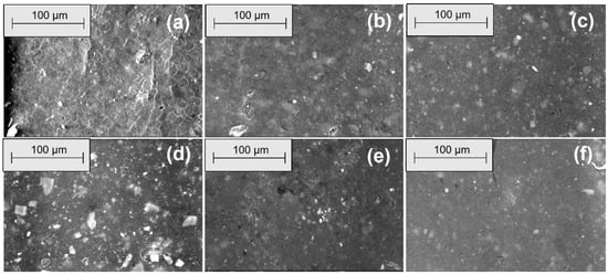 Figure 8 shows SEM micrographs of the composites’ longitudinal surfaces at 100× magnification. EPDM 0 (a) exhibits a smooth and homogeneous surface with minimal texture. With increasing wood sawdust content (EPDM 10 to EPDM 50), filler particles and fiber-like structures become more prominent. EPDM 20 (c) and EPDM 30 (d) show well-dispersed fillers with fewer agglomerates, while EPDM 40 (e) and EPDM 50 (f) display larger filler clusters and voids, indicating less uniform distribution and potential weak points in the composite matrix. Figure 9 presents SEM micrographs of the composites’ longitudinal surfaces at 500× magnification. EPDM 0 (a) displays a relatively smooth surface with small filler particles evenly dispersed. As the wood sawdust content increases from EPDM 10 to EPDM 50 (b–f), the presence of filler particles becomes more evident. EPDM 20 (c) and EPDM 30 (d) maintain good filler dispersion with fewer agglomerates, whereas EPDM 40 (e) and EPDM 50 (f) show more pronounced filler clusters and voids, indicating less uniform filler distribution and potential areas of weakness within the composite matrix.