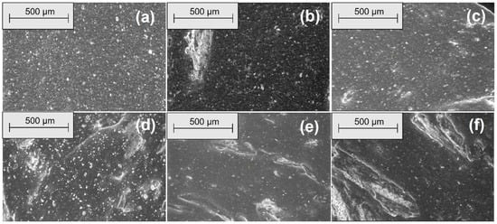 SEM microphotographs of surfaces from longitudinal cuts at 500× magnification: (a) EPDM 0, (b) EPDM 10, (c) EPDM 20, (d) EPDM 30, (e) EPDM 40, (f) EPDM 50.
