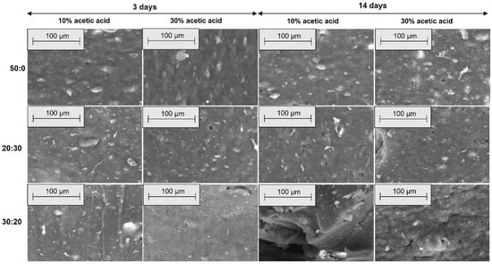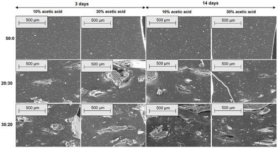SEM microphotographs of surfaces from transverse cuts at 100× magnification for EPDM 0 (50:0), EPDM 20 (20:30) and EPDM 30 (30:20) after acetic acid exposure.