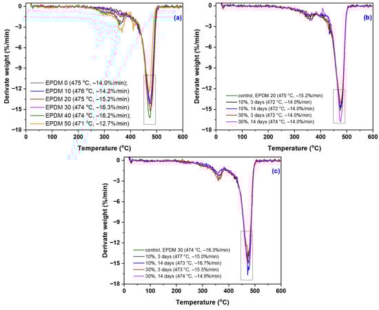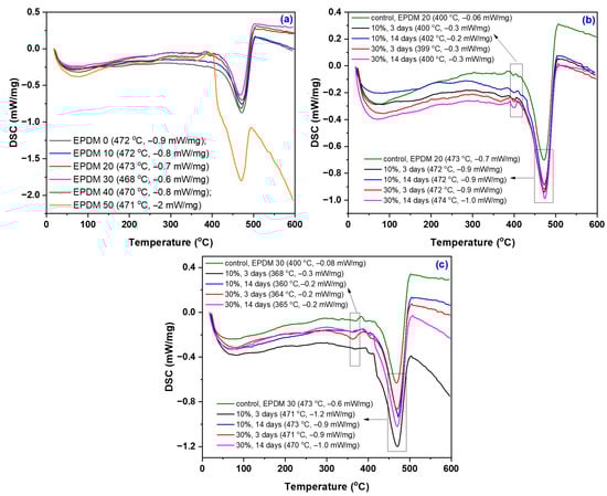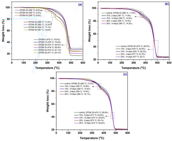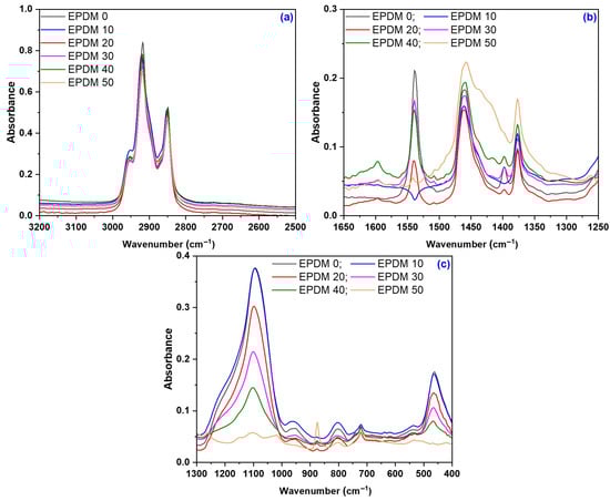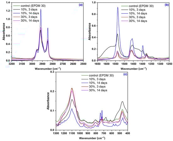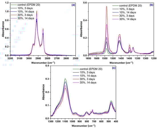 As shown in Table 4 and Figure 2, all composites exposed for three days in an acidic environment, regardless of the solution concentration, exhibited an increase in cross-linking degree. After 7 days, the only composite that showed a slight decrease in cross-link density (below 5%) was EPDM 20. After 14 days, only one composite exhibited an increase in cross-link density compared to the initial values (Table 2); however, compared to the first exposure period, this parameter actually decreased. The most stable composites (those whose cross-link density changed by only 0.5% to 4% as immersion time and acetic acid concentration increased from 10% to 30%) were EPDM 30 (0.51%) and EPDAM 20 (3.69%). The other composites suffered changes greater than 5% (EPDM 0 at 19.43%, EPDM 10 at 11.13%, EPDM 40 at 10.3%, and EPDM 50 at 5.39%). This observation correlates with the results from the swelling and mass loss experiments, where EPDM 20 showed decreased swelling and increased mass, likely due to reduced hygroscopicity of sawdust caused by acetylation of hydroxyl groups and ester bond formation [60,62]. During aging, the main molecular chain of peroxide-cured EPDM undergoes scission, resulting in the formation of double bonds and C=O structures. Additionally, peroxide-cured EPDM experiences a cross-linking reaction in the later stage of aging, forming an ether-cross-linked network that helps restore the degraded cross-linking structure [76]. These findings are also supported by changes in mechanical properties, where an increase in elongation at break is associated with molecular chain scission, while a decrease in elongation indicates polymer chain cross-linking [77,78]. In the presence of acetic acid, initial chain scission occurs due to chemical degradation, followed by increased cross-linking involving previously dangling chains in the rubber network, ultimately leading to an overall increase in cross-link density [76].