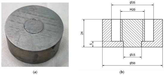 The tests were carried out on disc specimens made of St3 steel, with a diameter of 50 mm and a height of 24 mm. The specimens had a notched M20 threaded pin in their central part, which enabled the pull-off test. This allowed the level of mechanical adhesion of the coating to the substrate to be determined. A view and diagram of the samples used in the tests are shown in Figure 2.