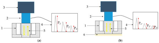 The concept of ultrasonic measurement; (a) before car putty coating application—stage I, (b) after car putty coating application—stage II; P1′, P2′, P3′—amplitudes of first, second, and third pulses in stage I of the experiment; P1″, P2″, P3″—amplitudes of first, second, and third pulses in stage II of the experiment; 1—sample, 2—ultrasonic head, 3—load, 4—flaw detector screen with pulses, 5—direction of ultrasonic wave propagation (yellow arrows), 6—car putty coating.