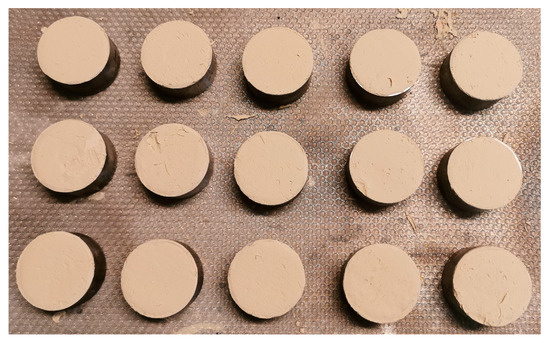 Between the stages of ultrasonic testing, a putty coating was applied to the previously prepared surface of the samples. This was the NOVOL 200 HYBRYD coating (Novol, Komorniki/Poznan, Poland), which can be applied to a variety of surfaces, including steel, aluminum, and galvanized steel. It is a modern multifunctional putty composed of a combination of glass microfibers and synthetic microsphere fillers, resulting in low volume shrinkage. The coating thickness was approximately 1 mm, consistent across all samples. The curing time of the coating was 25–30 min at 20 °C. During drying, a gradual color change was observed, from greenish when applied to a sandy color after curing. This change was due to chemical reactions between the putty base and the hardener (two-component putty). A view of the samples after the putty coating application is shown in Figure 4.