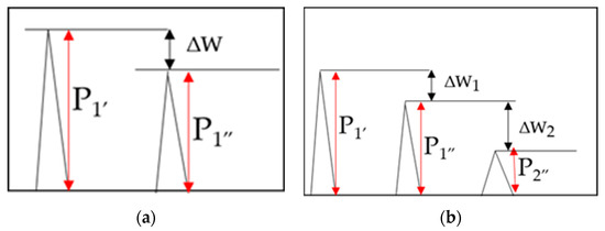 Figure 5. The concept of the reflection coefficient |r| measurement; (a) Method I; (b) Method II; P1′—amplitude of first pulse in stage I of the experiment; P1″, P2″—amplitudes of first and second pulses in stage II of the experiment, ΔW—amplification of the ultrasound wave pulse; ΔW1—amplitude drop of pulses P1′ and P1″; ΔW2—amplitude drop of pulses P1″ and P2″. - Method II consisted of determining the reflection coefficient using the three-echo method from the interface area (Figure 5b).