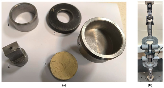 The concept of the pull-off test measurement: (a) components of the holder and sample; (b) holder with the sample during the pull-off test; 1—sleeve; 2, 4, 5—parts of the holder; 3—sample with car putty coating.