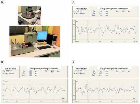 Roughness profile measurements: (a) measurement stand; (b) profile after glass bead treatment; (c) profile after sandpaper grinding; (d) profile after laser beam treatment.