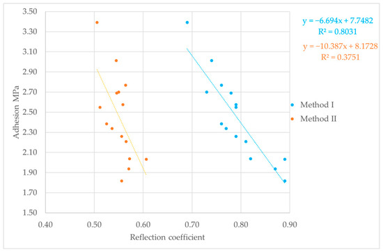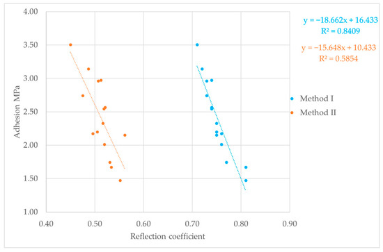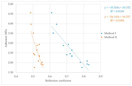 The final step in the study was to correlate the reflection coefficient results determined by the two different methods, with mechanical adhesion expressed in MPa and measured by the pull-off test. The results of these tests are shown in Figure 8, Figure 9 and Figure 10. Relating ultrasonic testing results to mechanical adhesion enables estimation of coating adhesion to substrates based on ultrasonic measurements and the calculated reflection coefficient. This correlation should consider the substrate preparation method, as it influences both the ultrasonic test results and mechanical adhesion.