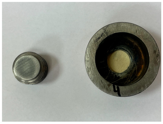 The final stage of the test involves verification of the ultrasonic measurements by determining the destructive strength of the coating–substrate interface using a pull-off testing machine (Cometech B1/E, Taichung City, China). The pull-off test was followed by pin detachment, during which the maximum force required to cause adhesive damage at the coating–substrate interface was recorded. A jaw feed rate of 25 mm/min was applied during the testing. For all specimens, the destructive test duration did not exceed 30 s. Figure 6 illustrates the holder used in the pull-off test and its mounting in the testing machine jaws.