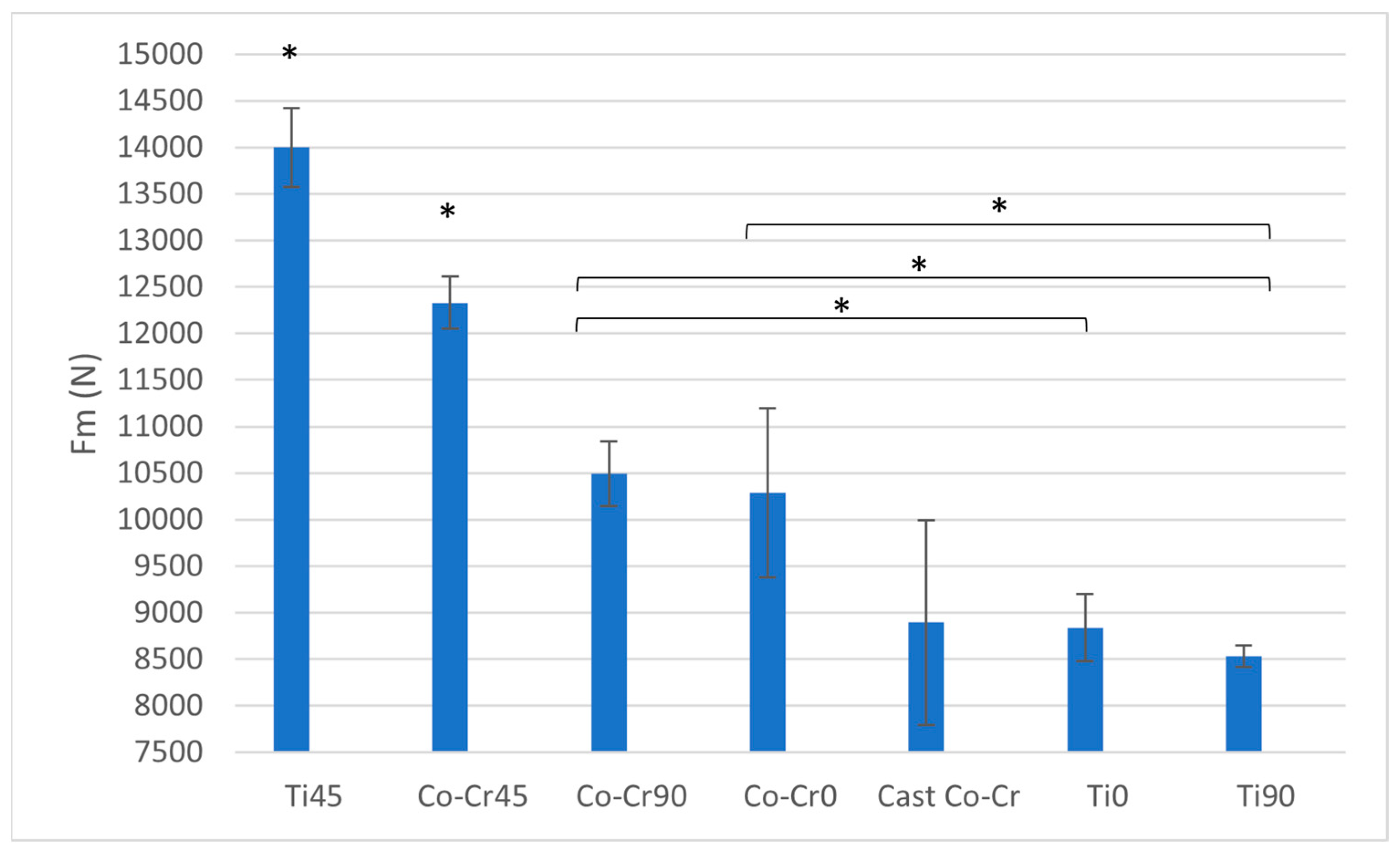 - Camacho Resotto, A.G.; Cordeiro, J.M.; Camacho Presotto, J.G.; Rangel, E.C.; da Cruz, N.C.; Landers, R.; Barão, V.A.; Mesquita, M.F. Feasibility of 3D-Printed Co–Cr Alloy for Dental Prostheses Applications. J. Alloys Compd. 2021, 862, 158171. [Google Scholar] [CrossRef]