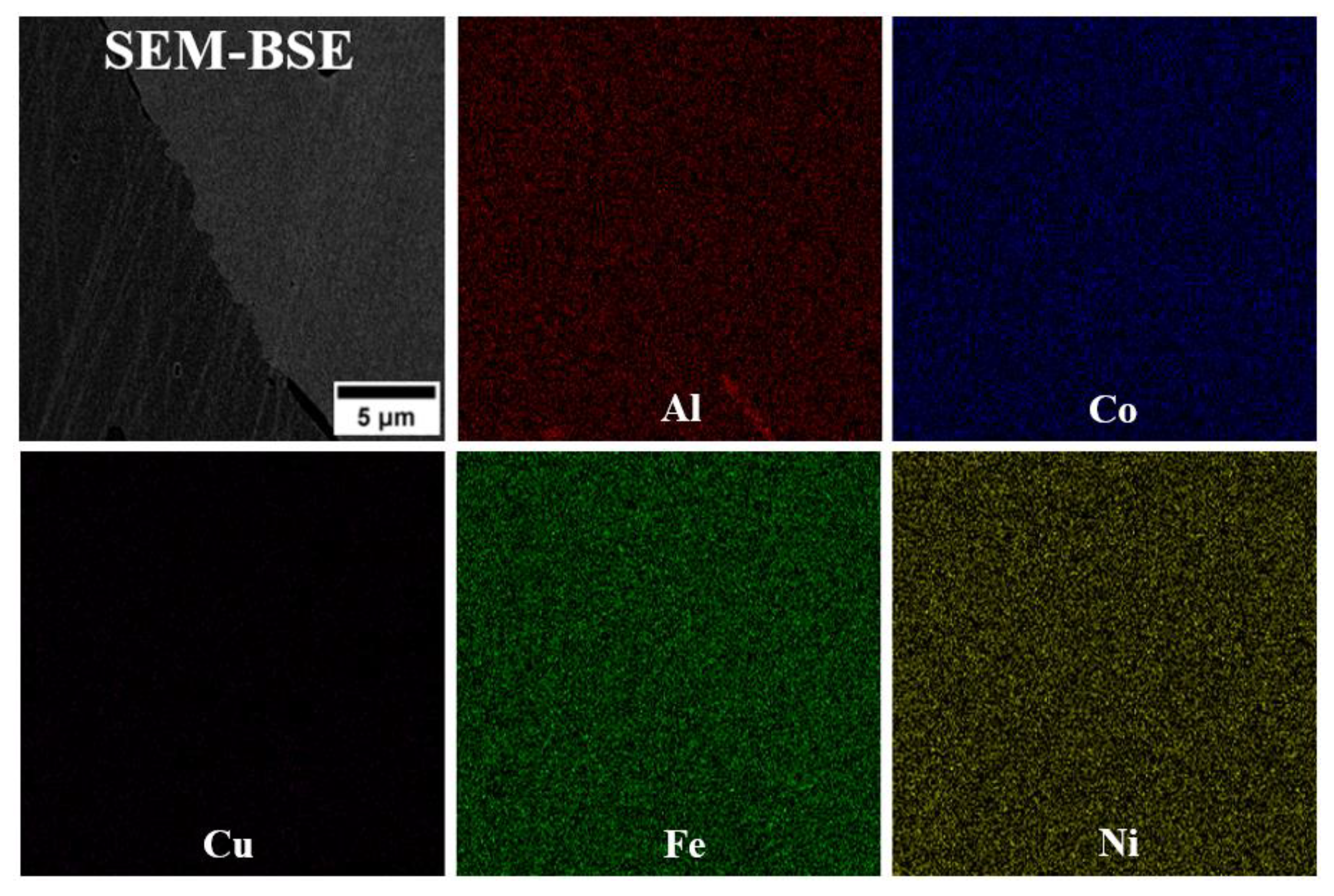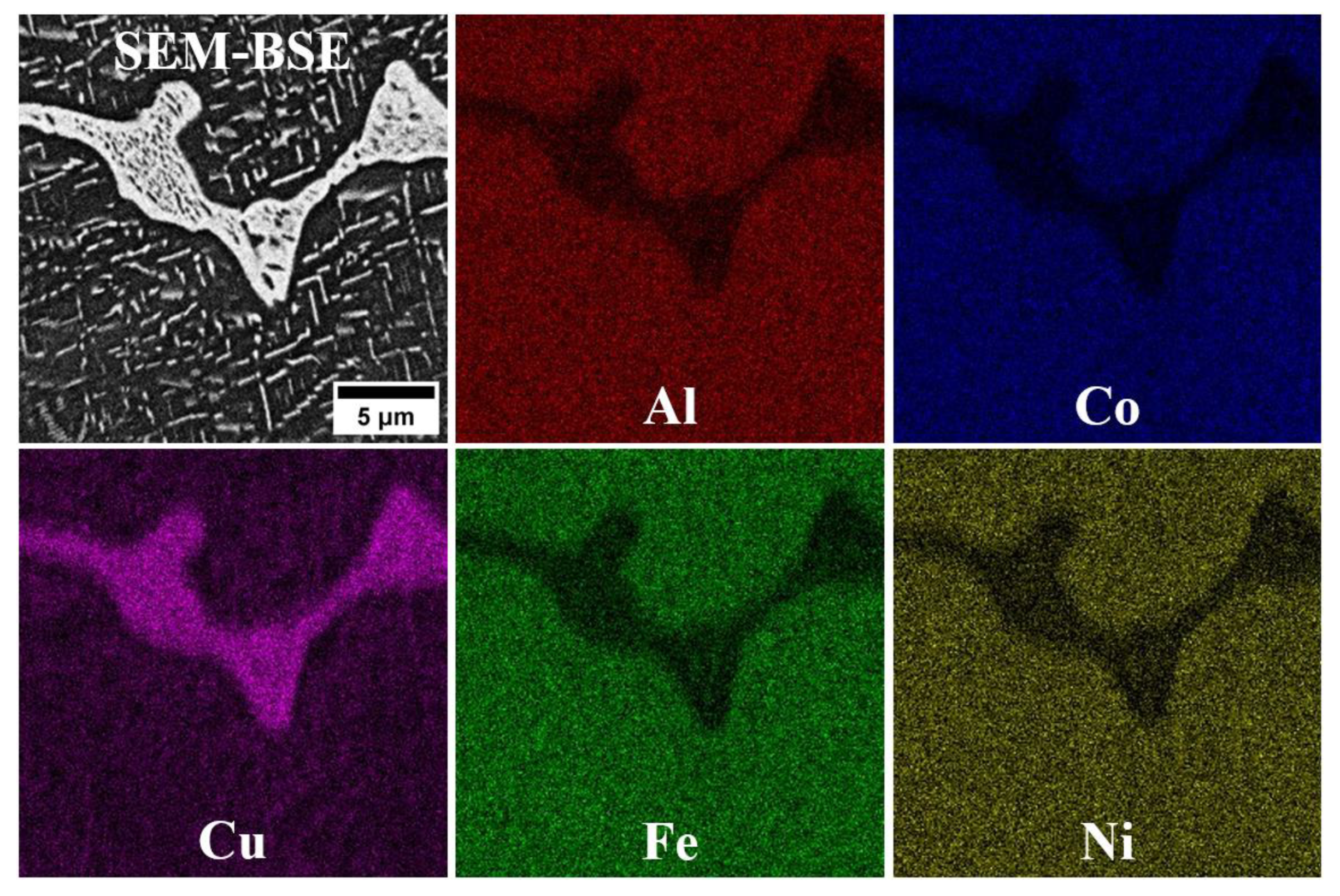 - In the microstructure of the equiatomic D5 alloy, the two phases exhibit distinct chemical compositions and hardness. The SEM-EDS analysis indicates that Al and Cu tend to segregate significantly, whereas Co shows the least susceptibility to segregation.