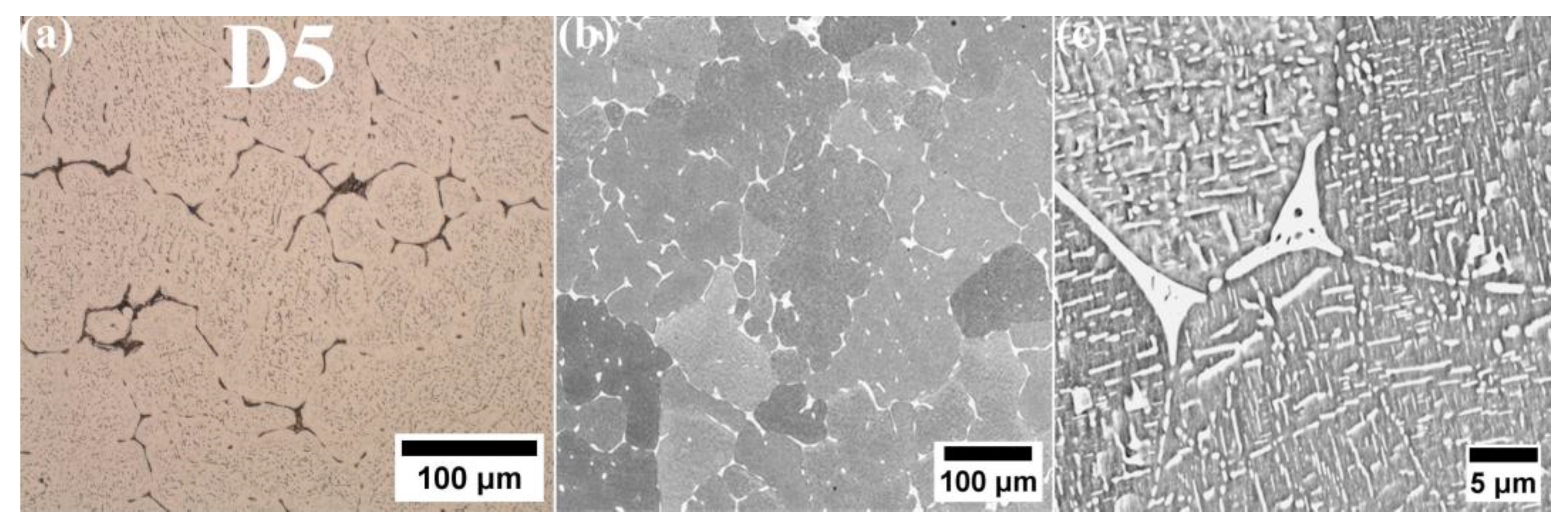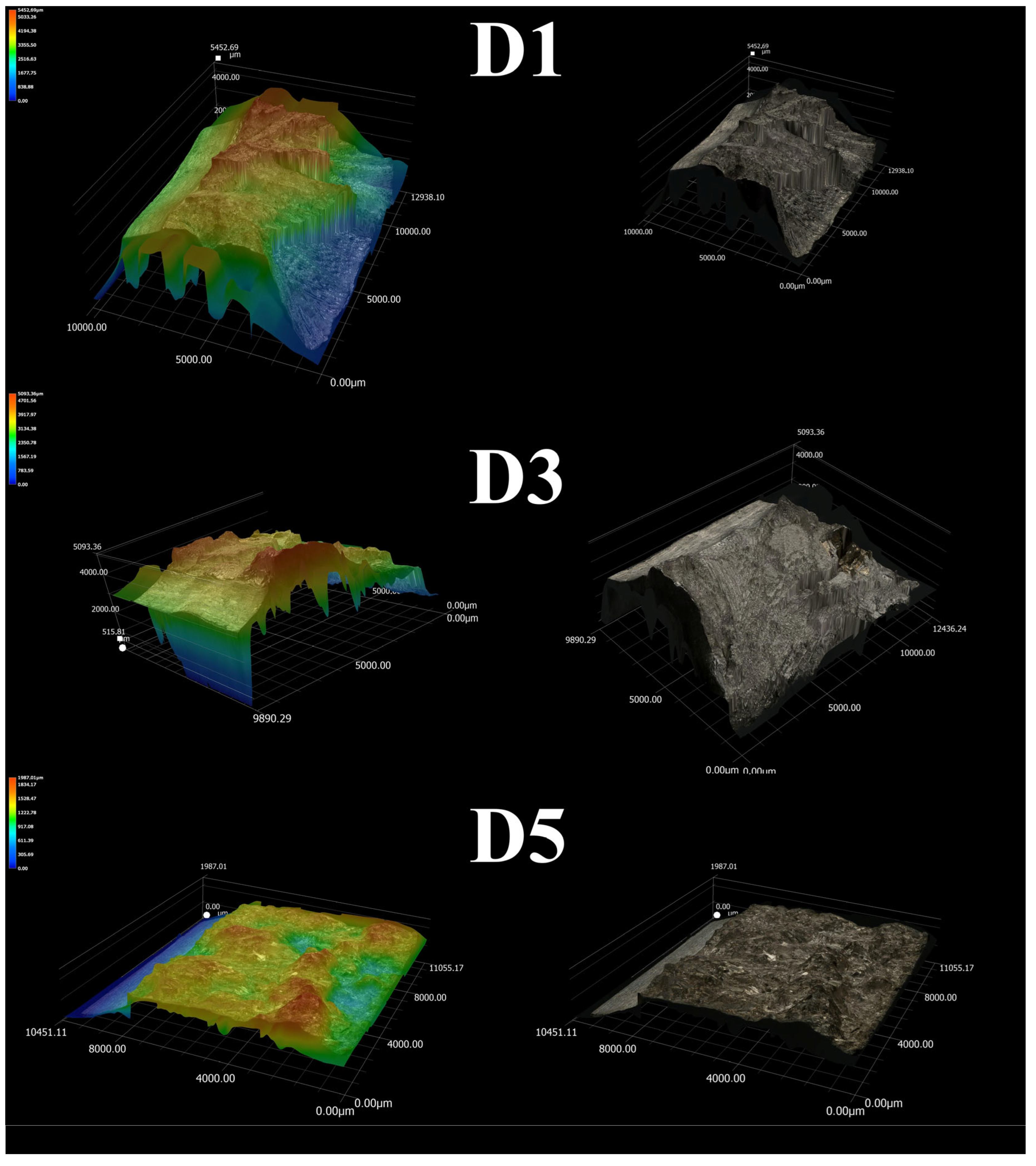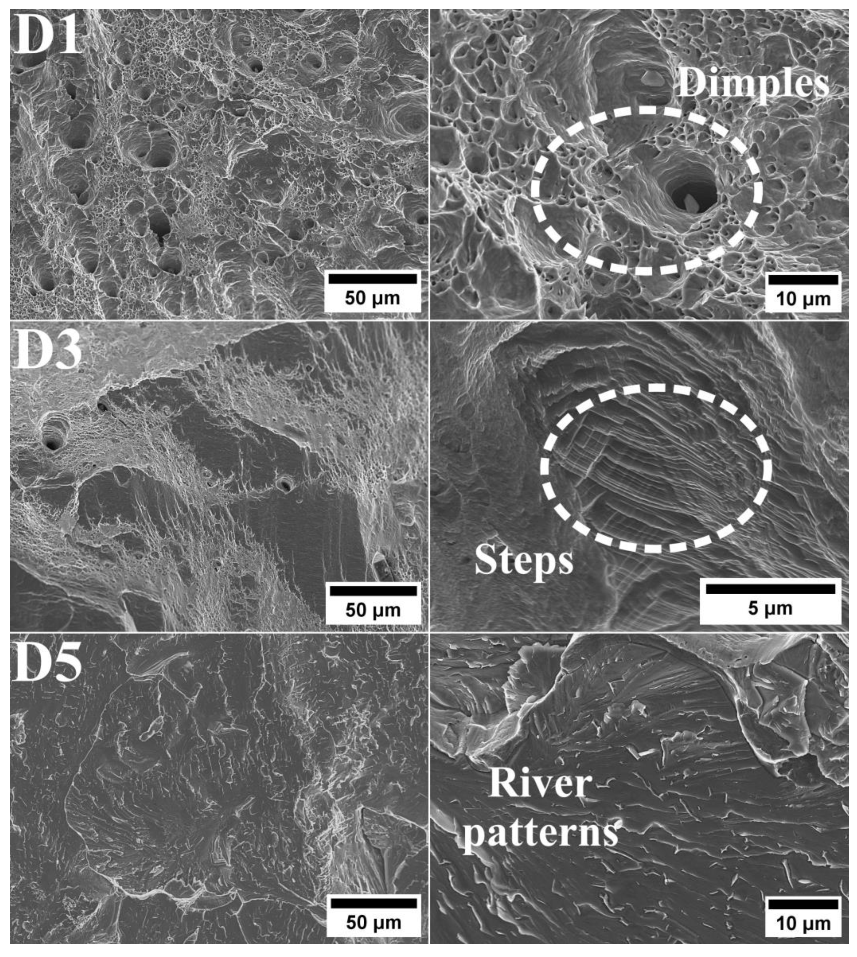 - Fractographic analysis confirmed the brittle nature of the fracture in D5 alloy. In contrast, D1 and D3 alloys exhibited larger areas of ductile fractures characterized by prominent dimples.