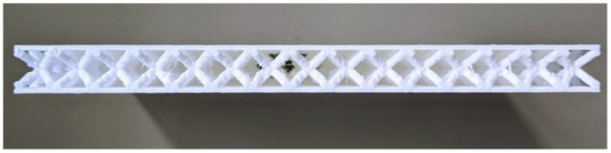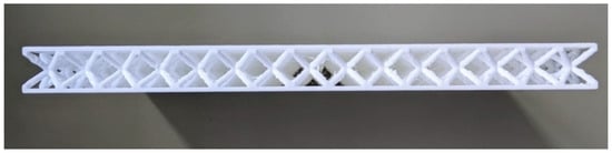 All specimens, fabricated from PLA, exhibit the mechanical properties detailed in Table 1. These include the elastic modulus (E), which describes the stiffness of the material in its elastic regime, and the yield strength (), marking the onset of plastic deformation. Alongside these, the table reports the strain at break (), which quantifies the material’s ability to deform before failure, and the ultimate strength (), indicating the maximum stress sustained before rupture. To obtain these properties, three dog bone specimens were tested under tensile test conditions in accordance with ASTM D638 standards [28], with an average weight of 10.26 g and a standard deviation of 0.5 g.