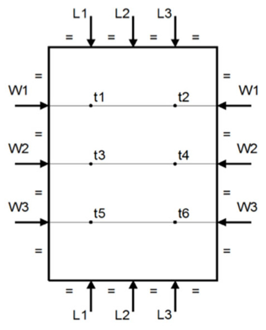 The specimens were tested using the CEAST Fractovis Plus machine (Instron, Norwood, MA, USA), as in the works of Gonzalez et al. [30] and Al-Shamary et al. [31]. In the present experimental tests, a hemispherical impactor with a diameter of 16 mm and a mass of 2 kg was released from a height of 150 mm, resulting in an impact energy of approximately 2.94 J and an impact velocity of about 1.72 m/s. Before each test, appropriate measurements were taken using a digital caliper. Specifically, the widths () at various points i were measured, along with the lengths () and the thicknesses (). Moreover, an electronic balance was used to measure the mass values. In Appendix A, Table A1, Table A2 and Table A3 provide the width, length, and thickness measurements, while Table A4 shows the mass values. In addition, Figure 4 provides a representation of the points where the measurements were taken.