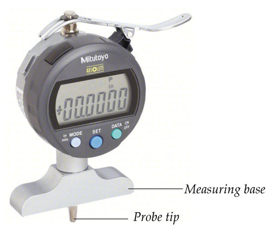 - Mitutoyo Corporation 547-217S ABSOLUTE Digimatic Depth Gauge—Technical Data. Available online: https://www.mitutoyo.com/webfoo/wp-content/uploads/1966_ABS_Dig_Ind_ID-C.pdf (accessed on 7 September 2025).