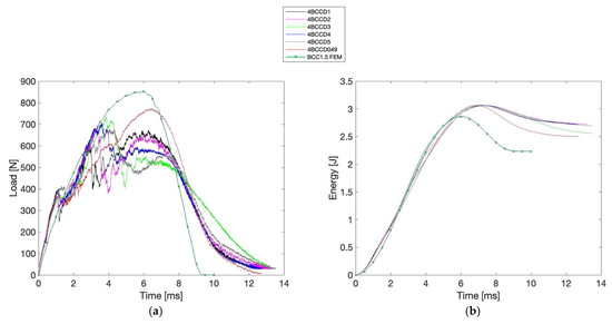 Figure 7 and Figure 8 display the time–load, time–energy, time–displacement, and displacement–load diagrams for the BCC1.5 and BCC2 specimens, respectively, in which the numerical (FEM) curves are also reported.