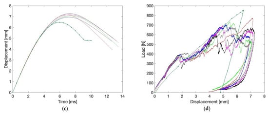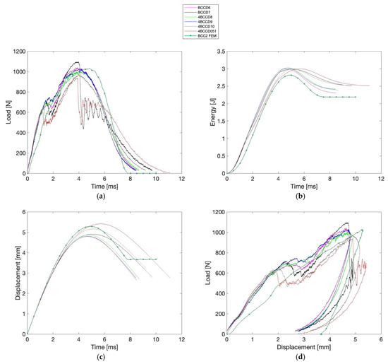 (a) Time–Load, (b) Time–Energy, (c) Time–Displacement, and (d) Displacement–Load diagrams for BCC2 samples.
