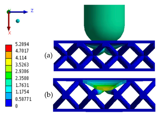 Furthermore, as in the experimental tests, the impactor was dropped from a height of 150 mm. The support base and the clamps were modeled as rigid and flexible, respectively. All contacts were defined as frictional with a coefficient of friction set to 0.2, which was chosen based on numerical fitting considerations. Moreover, all parts of the model were discretized using four-node linear tetrahedral elements. Given the role of each component in the simulation, the mesh was designed with a variable element size depending on the object. In both simulations, the impactor was meshed with an element size of 2.5 mm, the base with 8 mm, and the clamps with 4 mm. The lattice structure was meshed more finely, with an element size of 0.8 mm for the BCC1.5 and 0.9 mm for the BCC2. The total number of mesh elements was 1,094,012 for BCC1.5 and 836,925 for BCC2. Also, before conducting the analysis, appropriate boundary conditions were defined as follows: the base was fully constrained, a displacement perpendicular to the structure’s upper skin was applied to the impactor, and a force of 50 N was applied to each clamp to prevent any movement of the structure during impact. This clamping force was chosen to avoid bending phenomena on the top skin, which could occur with higher values.