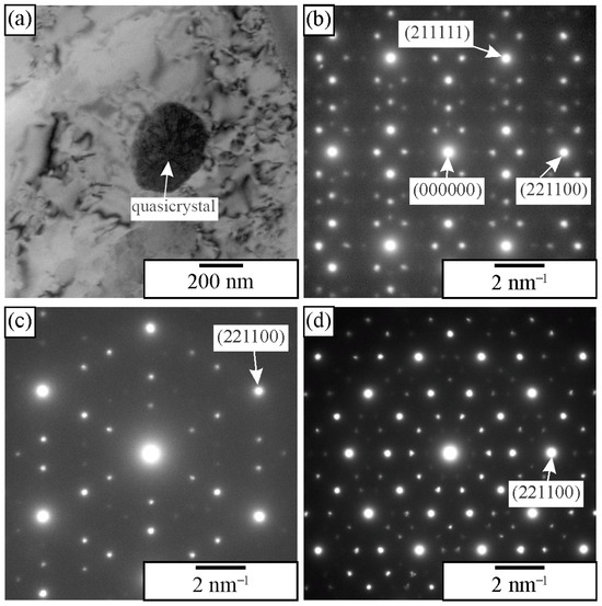 The best way to identify quasicrystals is through electron diffraction in TEM (Figure 6). The diffraction patterns of an IQC particle with the zone axes parallel to two-, three-, and fivefold axes correspond to Figure 6b–d, respectively. A system with six indices is used to index icosahedral quasicrystals. For details, a reader should consult, for example, references [14,57,58]. In order to be able to index the reciprocal lattice spots as a combination of integers, at least six basis vectors are required for the icosahedral phase, and five for the decagonal phase. Elser [57] selected the six vectors for indexing the IQC diffraction pattern, which can be obtained by a projection of a cube in six dimensions to three dimensions. The Bragg vector for each diffraction peak is expressed as a linear combination of basis vectors multiplied by integer indices, scaled by a factor called the quasilattice parameter. The observable reciprocal space spot nearest to the transmitted beam along a fivefold direction (vertex vector) is indexed as (100,000).