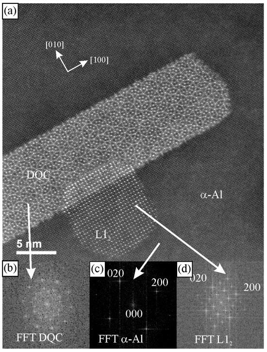 Figure 8 shows the image, the diffraction pattern of DQC in a periodic α-Al matrix, and the presence of the ordered L12 structure. The quasiperiodic structure is evident (Figure 8a), and the diffraction pattern (Figure 8b) shows the tenfold rotational symmetry.