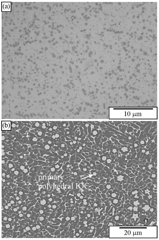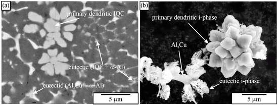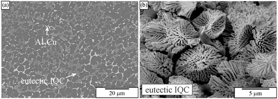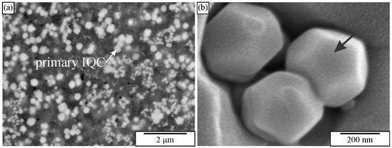 Figure 10 shows the microstructure of an Al-Cu-Mn-Be alloy in the as-cast state. The sample was investigated in a polished condition, without any etching. The sizes of polygonal quasicrystalline particles are 2–5 μm. The light micrograph (Figure 10a) does not have sufficient resolution to reveal the characteristics of the quasicrystalline particles. On the other hand, the backscattered electron micrograph reveals some features of quasicrystalline particles (Figure 10b). Some particles are pentagonal, whereas most of them are hexagonal.