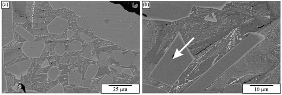 The metallographic preparation of aluminium alloys usually follows general procedures. It often starts with sawing the samples to appropriate sizes, hot or cold mounting into a polymeric resin, grinding with SiC papers, and polishing with different diamond pastes or alumina suspensions (usually 9, 6, and 3 µm), a colloidal suspension of 0.06 µm SiO2, and etching [144]. By mechanically preparing aluminium samples, one should avoid grinding with the finest grinding papers and diamond paste, since SiC and diamond particles can be incorporated into a soft aluminium matrix. The deformation layer is progressively thinned with sequential grinding and polishing steps [143]. Vibrational polishing can effectively remove the deformation layer, making samples appropriate for HR SEM, EDS, and EBSD investigations [156]. In our time, ions can also remove the deformation layer (e.g., argon ions in cross-section polishers). However, parameters should be carefully optimised to avoid the appearance of ion-induced artefacts [157]. Nevertheless, chemical etching is commonly used for light microscopy observations because the microstructure details are hardly visible without etching [158]. On the contrary, polishing without etching can give convenient results when using scanning electron microscopy [94,159]. Examining a polished surface before etching is crucial since a general overview of the microstructural constituents can be obtained. Slight etching can remove a surface deformation layer. A shallow groove formed at grain boundaries and a thin step formed at the particle/matrix interface can increase contrast and make identifying microstructural constituents easier when using a secondary electron detector. Additionally, polished surfaces allow for the most reliable microchemical analysis [160,161]. A classical strong etchant is not always appropriate for scanning electron microscopy, since it can dissolve some phases and deteriorate microstructural and chemical analyses. Thus, modification of established procedures is required [162]. Sometimes, metallographic preparation is taken for granted, and the preparation details are not given. Nevertheless, the inconvenient use of etchants can be identified by inspecting micrographs (look at SEMs in Ref. [163]). Thus, comparing polished and etched specimens is advisable to reveal potential etching artefacts. Etching is unnecessary when using a backscattered electron detector, and the phases have different backscattering coefficients (having elements with different atomic numbers Z) [148]. Thus, microstructural constituents of varying chemical compositions can be distinguished with slight etching or even without it.