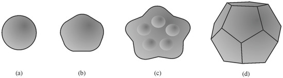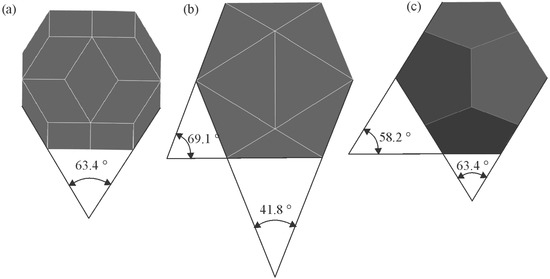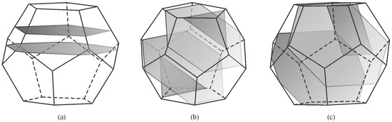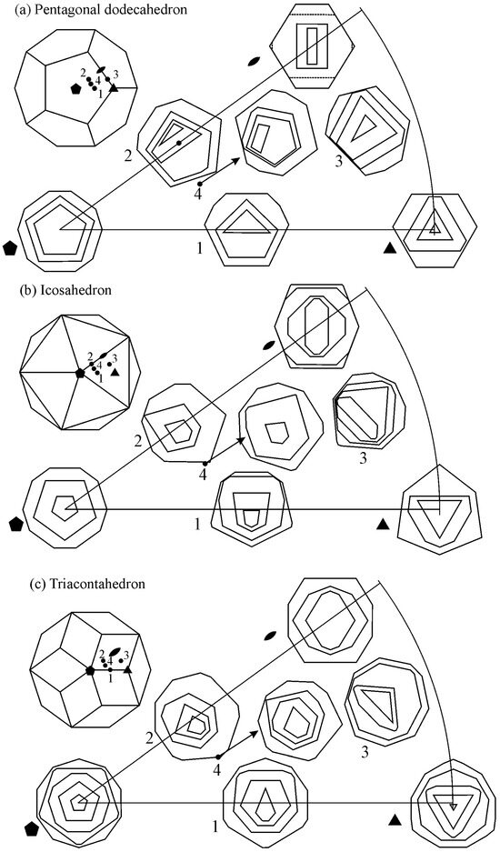 To understand the shapes of particles in 2D, sections should be made through a pentagonal dodecahedron (Figure 12) and other possible shapes of primary icosahedral quasicrystals (Figure 13). In Figure 12, the intersecting planes are perpendicular to a pentagonal dodecahedron’s two-, three-, and fivefold axes. Intersections have different shapes, triangles, rectangles, pentagons, hexagons, octagons, and decagons, depending on where the metallographic plane intersects a polyhedron.