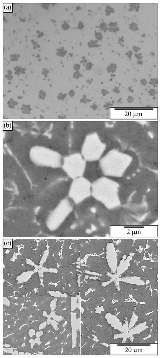 Quasicrystals in Al-Mn alloys can form at very high cooling rates (105 K/s). Casting into metallic moulds cannot produce such cooling rates; the highest cooling rates can be a few thousand K/s. Under such conditions, quasicrystals do not form, but the orthorhombic Al6Mn phase does [173]. Adding several alloying elements can reduce the critical cooling rate for quasicrystal formation. Kim et al. [174] obtained a quasicrystal phase in a bulk Al93Fe3Cr2Ti2 alloy. The quasicrystalline phase also appeared in the Al-Mn-Be alloy [163,175,176,177], Al-Mn-Fe-Si-V [178], and Al-Mn-Ce alloy [179]. Stan-Głowińska [180] discovered quasicrystals in Al-Mn base alloys alloyed with Cr, Co, Ni, and Cu additions. Leskovar et al. [181] created primary metastable quasicrystals in Al-Mn-Si alloys alloyed with Zn, Ca, and Sr. Primary quasicrystalline phases are also formed in magnesium alloys [182]. Thus, quasicrystals appeared in different sizes and shapes, which can be identified using metallography, as explained in detail in Ref. [183]. The primary quasicrystals can have polygonal or dendritic shapes [167,169,171,184,185]. The same or similar shapes can also appear in the other alloys.