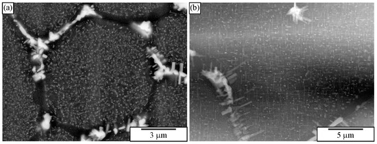 IQC and other quasicrystalline precipitates are relatively small, ranging from 10 to 100 nm. They can be thoroughly investigated in TEM. However, TEM samples are small, and the distribution of precipitates can be determined in a relatively small area. Thus, developing a metallographic procedure that enables observing as many tiny particles as possible in HR SEM is imperative. Österreicher et al. [162] developed a procedure for revealing the Mg2Si precipitates in Al-Mn-Si alloys using 30% nitric acid in methanol. The same method dissolved quasicrystalline precipitates in the authors’ laboratory. However, there is an ongoing investigation regarding the development of metallographic methods to identify small nanosized quasicrystalline particles. The preliminary findings using mechanical polishing with colloidal SiO2 and etching using diluted hydrogen peroxide, H2O2 show promising results (Figure 15). Colloidal silica with a granulation of 0.06 µm and 30% hydrogen peroxide in water with a ratio of 5:1 was used. Polishing with small abrasive grains and low surface tension removes the oxide layer and slightly embosses the surface. The procedure takes 1 to 2 min, with mandatory ultrasonic cleaning in distilled water without using cleaning alcohol. Quasicrystalline particles with a size of 30–50 nm and L12 precipitates with a size of 10–20 nm can be seen. The method needs considerable improvement since several artefacts appear at the nanoscale (bright ridges in Figure 15) [208].