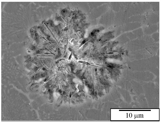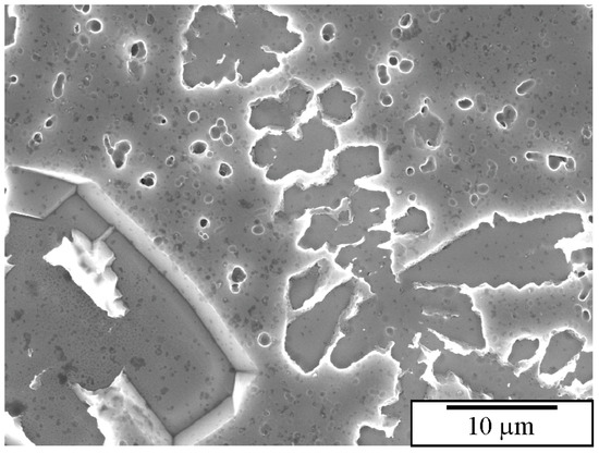 Figure 19. The scanning electron micrographs of the microstructure of alloy Al94Mn2Be2Cu2 with a footprint of the primary quasicrystalline particles after etching for 30 s in a solution of 5 mL of HNO3, 2.5 mL of HCl, and 70 mL of alcohol [236].