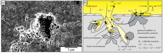 Figure 20. Characteristic of deep etching in iodine-methanol solution. (a) The scanning electron micrographs of the hole on the surface of the sample. (b) A schematic presentation of the deep etching of an aluminium alloy, which contains an intermetallic phase [236]. Arrows indicate the movements of the ions.