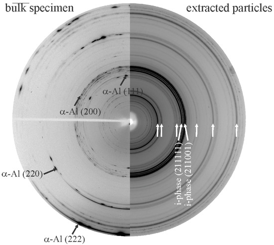 Figure 22. Two-dimensional diffraction patterns of a multiphase Al-Mn-Be alloy in the as-cast condition after using synchrotron radiation. (Left) In the bulk specimen, the powder pattern shows incomplete Al rings, indicating a small number of Al grains, and the rings of other phases are relatively weak. (Right) Extracted particles. The Al-rich matrix is dissolved, and lines of minor phases, indicated by the arrows, become more pronounced. Only the most significant rings of the IQC phase are indicated [233].
