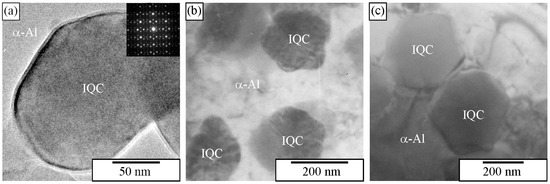 IQC precipitates can form in many Al-alloys. They precipitate from the supersaturated solid solution. Hansen and Gjonnes [190] found a metastable IQC phase in a heat-treated Al-Mn alloy, which subsequently transformed to the cubic α-AlMnSi phase. Li and Arnberg [191] discovered IQC dispersoids in a commercial 3003 alloy, which precipitated at the early precipitation stage. Quasicrystalline precipitates also formed during ageing in Al-Mn-based alloys fabricated by SLM [150]. Mochugovskiy et al. [192,193,194] discovered IQC precipitates in some Al-Mg-Mn alloys during annealing. Zhan et al. [195] studied nucleation and growth of quasicrystal-related precipitates in Al-Er-Fe alloys. Yang et al. [5] found quasicrystalline clusters in Al-Mg-Zn alloys. Quasicrystalline precipitates also occur in commercial Al-Cu-Li alloys [196,197]. Quasicrystalline precipitates also formed as one of the three strengthening precipitates in an Al-Zr-Gd(Yb) alloy [198]. Zr, Gd, and Yb formed L12 precipitates, but the Fe and Si impurities formed IQC precipitates.