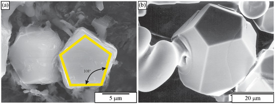 Figure 27. Secondary electron micrographs of IQC particles with pentagonal dodecahedral morphology are presented in Figure 10b. (a) Alloy Al-Mn-Be, the yellow regular pentagon fits on the particle facet, and the ideal angle between two pentagon edges, and (b) alloy Al-Cu-Fe [188].
