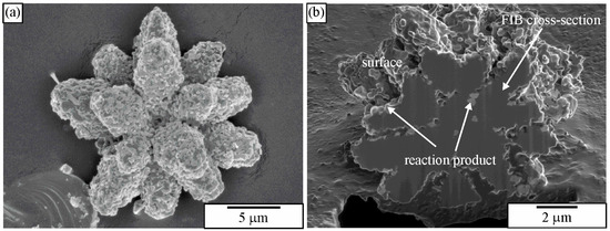 Figure 29. Extracted icosahedral dendrite with the arms in threefold directions. (a) A secondary electron SEM micrograph of an extracted quasicrystalline particle (alloy Al-Mn-Be-Cu after annealing at 500 °C for 5 h) is covered by reaction products. (b) Extracted quasicrystalline particle after FIB cross-sectioning (ion-induced secondary electrons). Internal structure is revealed, with the particles of a new phase appearing on the surface of the quasicrystalline particle and inside it [233].