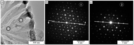 Figure 31. Eutectic IQC extracted by iodine-methanol solution. (a) The bright-field micrograph in TEM. (b) Selected area diffraction patterns taken along a fivefold axis at position one are indicated in (a). Arrows indicate the rotation direction of the diffraction patterns when moving from point 1 to 2. (c) Selected area diffraction patterns taken along a fivefold axis at position 2 indicated in (a) [186].