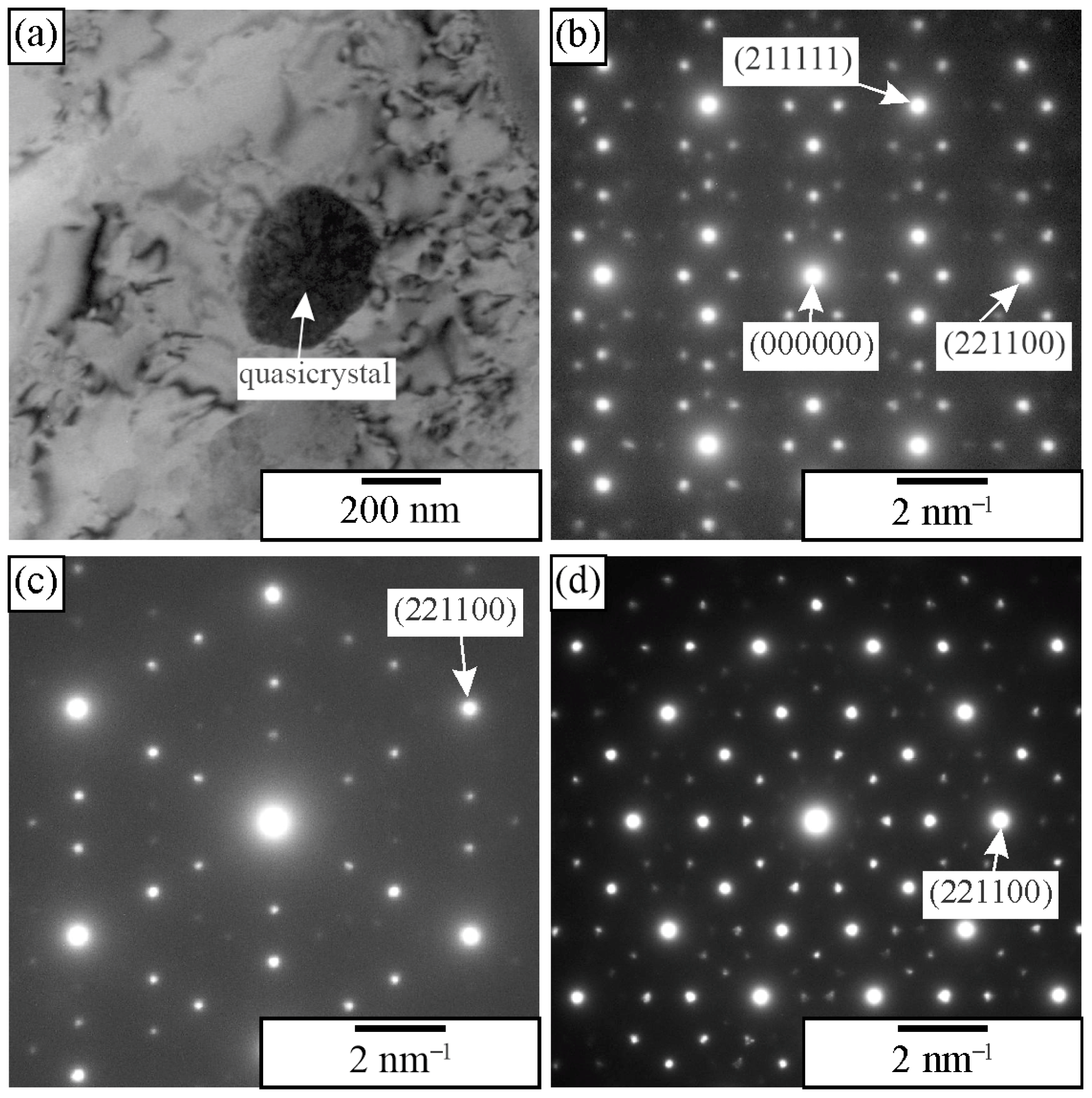 - Labib, F.; Ohhashi, S.; Tsai, A.P. Formation and crystallographic orientation study of quasicrystal, 2/1 and 1/1 approximants in Cd-Mg-Y system using electron backscatter diffraction (EBSD). Philos. Mag. 2019, 99, 1528. [Google Scholar]
