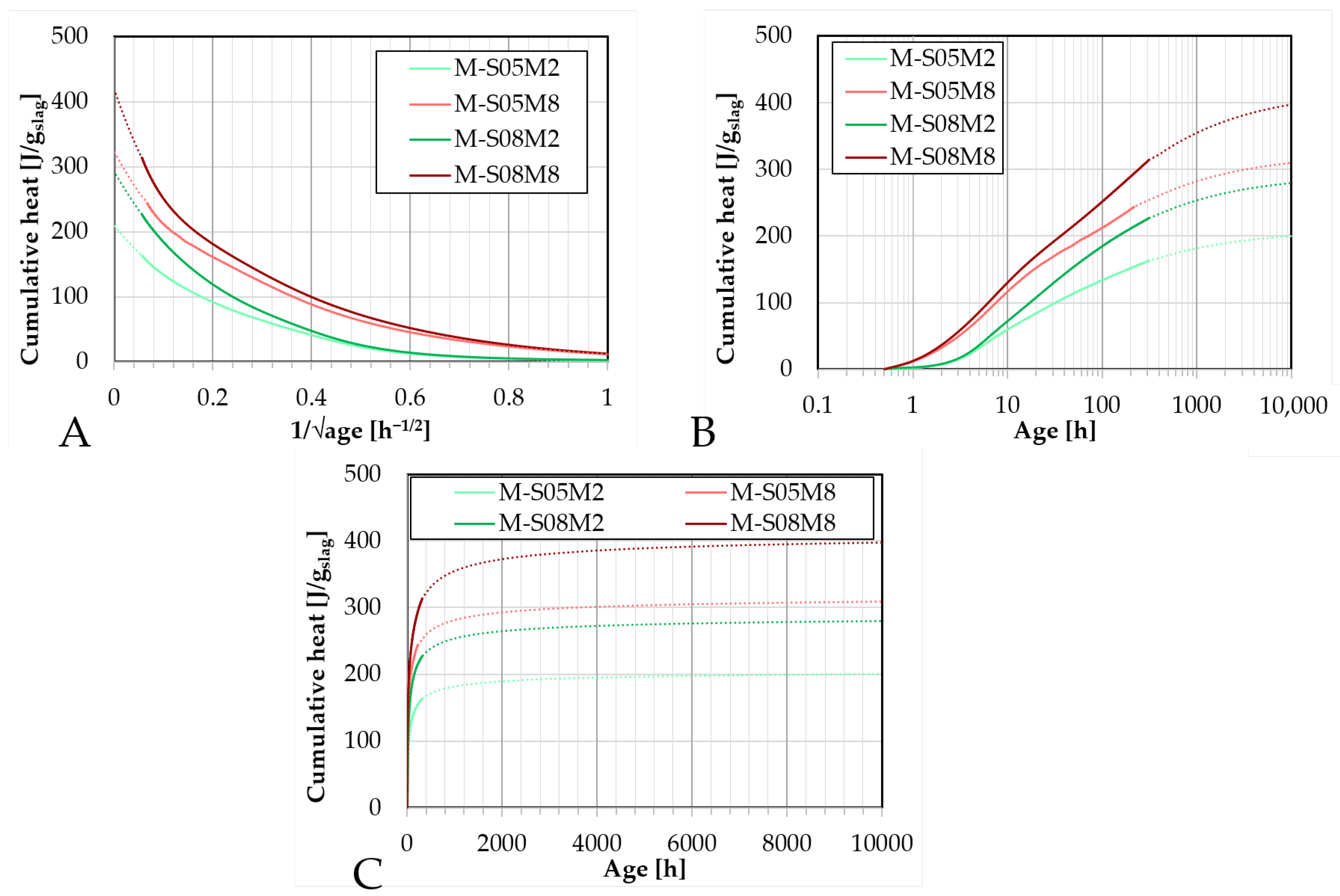 Fitting and extrapolation results (dotted lines) of AAS mortar to determine the ultimate heat based on the cumulative heat results (full lines): A. as function of the inverse of the square root of the age; B. as function of the age (logarithmic scale); C. as function of the age.