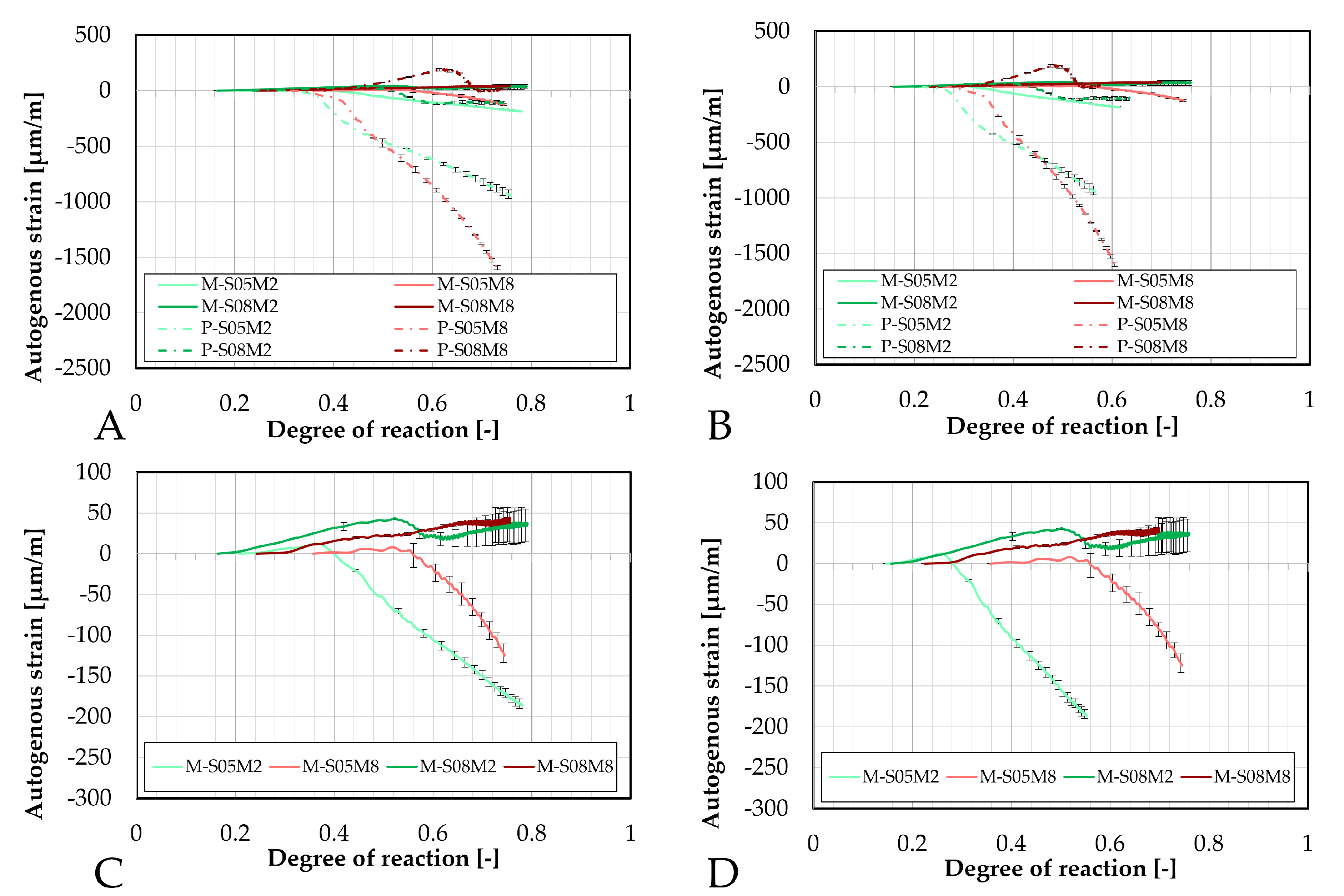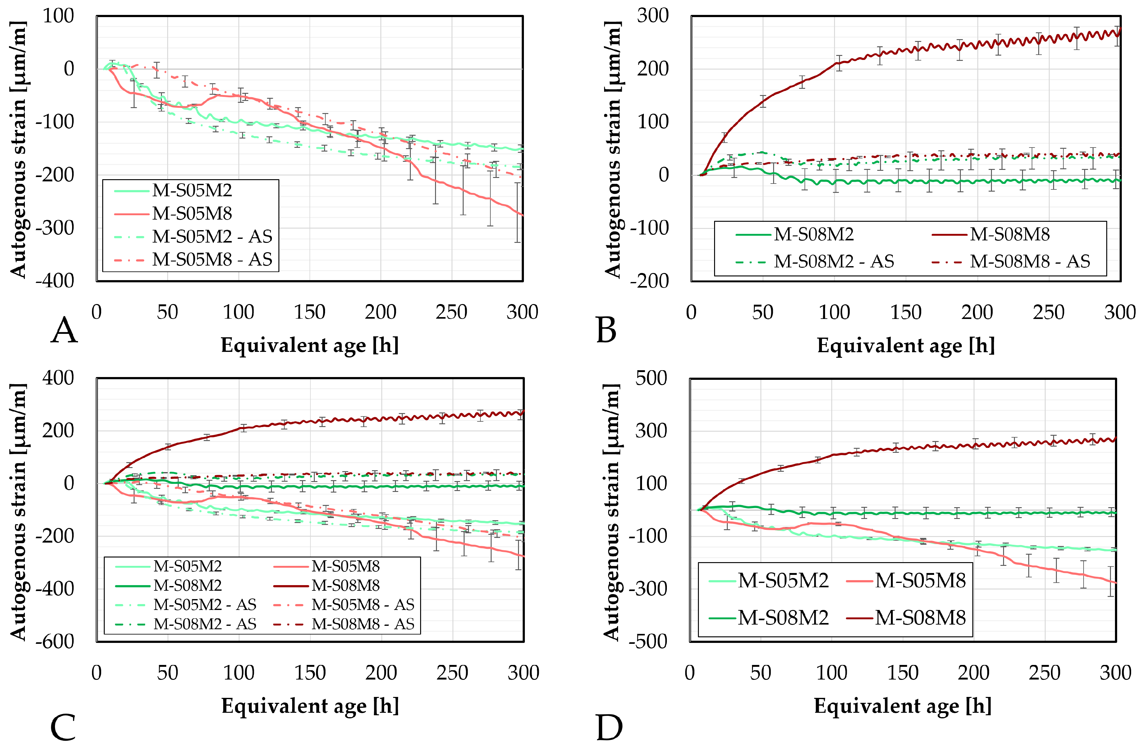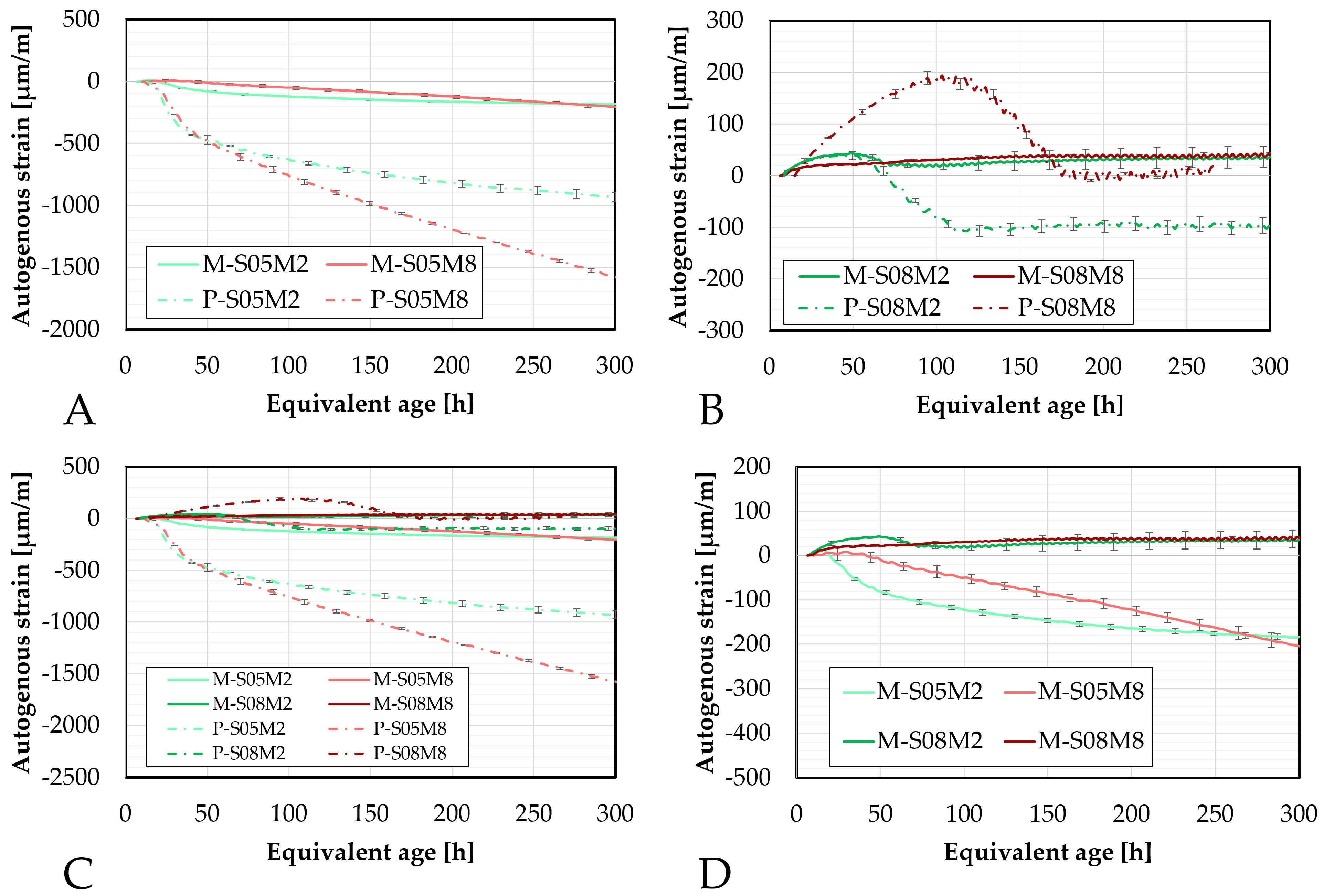 Autogenous strain of AAS mortars obtained with the corrugated tubes method, presented as a function of the equivalent age: (A). Compositions activated with S/B = 0.5 (compared to the equivalent paste compositions), (B). Compositions activated with S/B = 0.8, (C). Comparison of all mortar and paste compositions, (D). Comparison of the mortar compositions. M = mortar, P = paste.