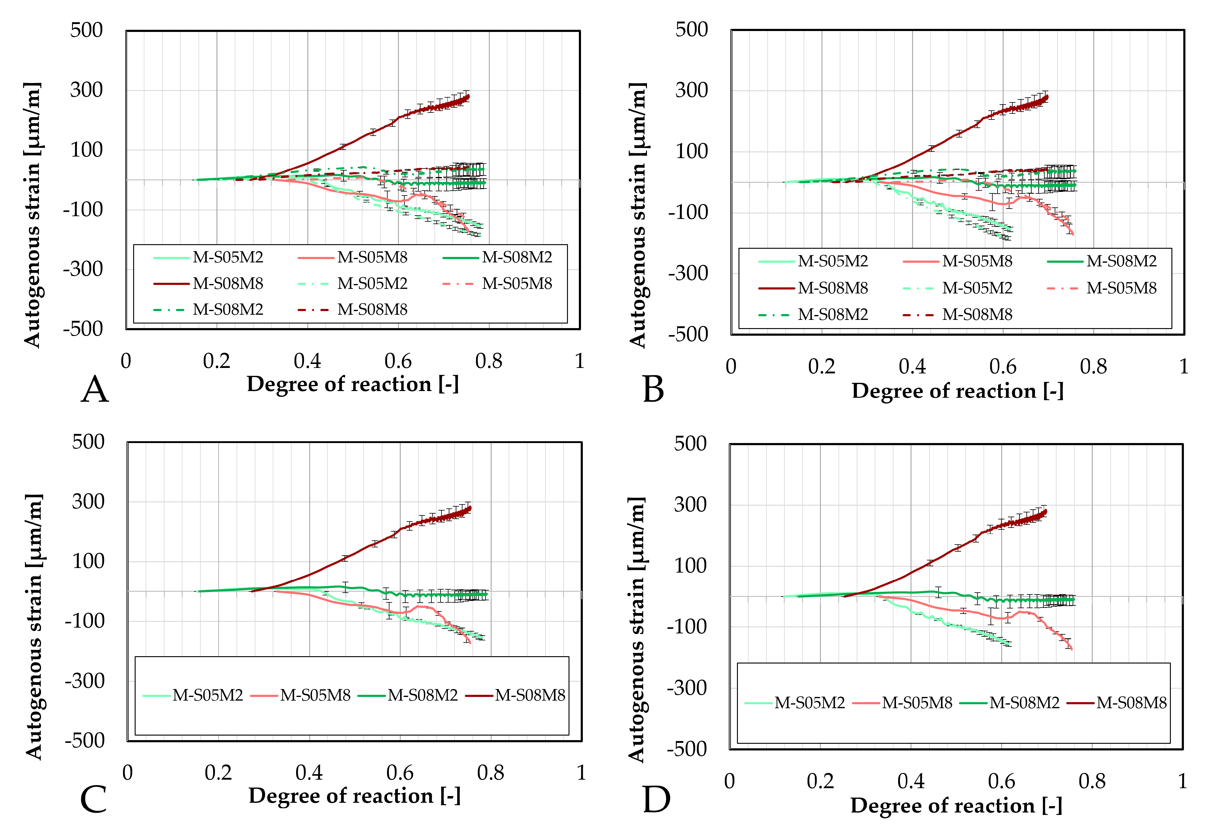 Comparison of the autogenous strain obtained with the corrugated tubes method for all AAS mortar compositions as function of the degree of reaction: (A). determined with polynomially fitted ultimate heat compared to the paste samples, (B). determined with the exponentially fitted ultimate heat compared to the paste samples, (C). determined with polynomially fitted ultimate heat, (D). determined with the exponentially fitted ultimate heat.