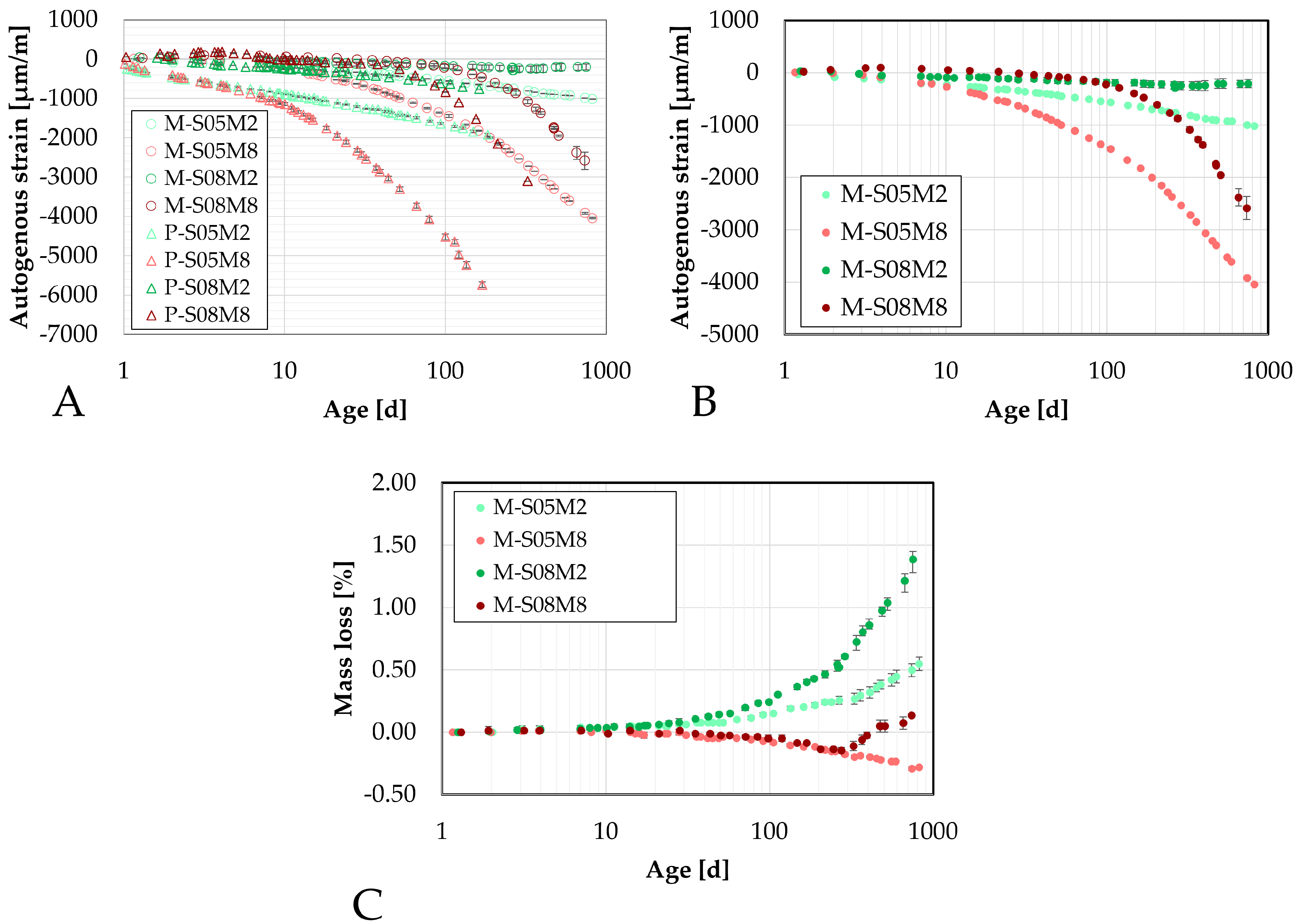 Autogenous strain of AAS mortar measured on the small DEMEC samples as function of the age: (A). comparison with the paste scale, (B). Comparison of the mortar scale, (C). Mass loss evolution.