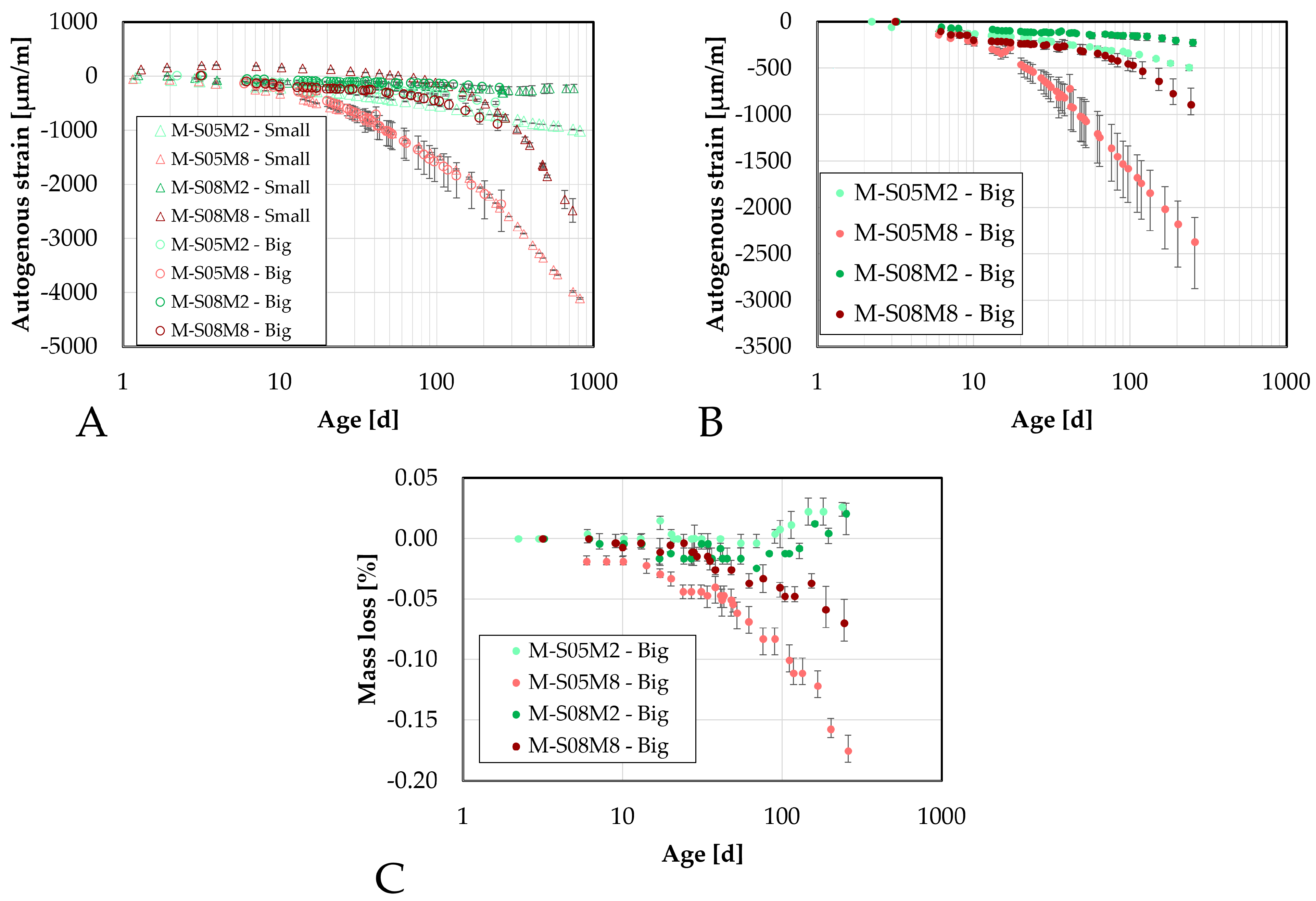 Autogenous strain of AAS mortar measured on the big DEMEC samples as function of the age: (A). comparison with the small scale, (B). Comparison of the mortar scale, (C). mass loss evolution.