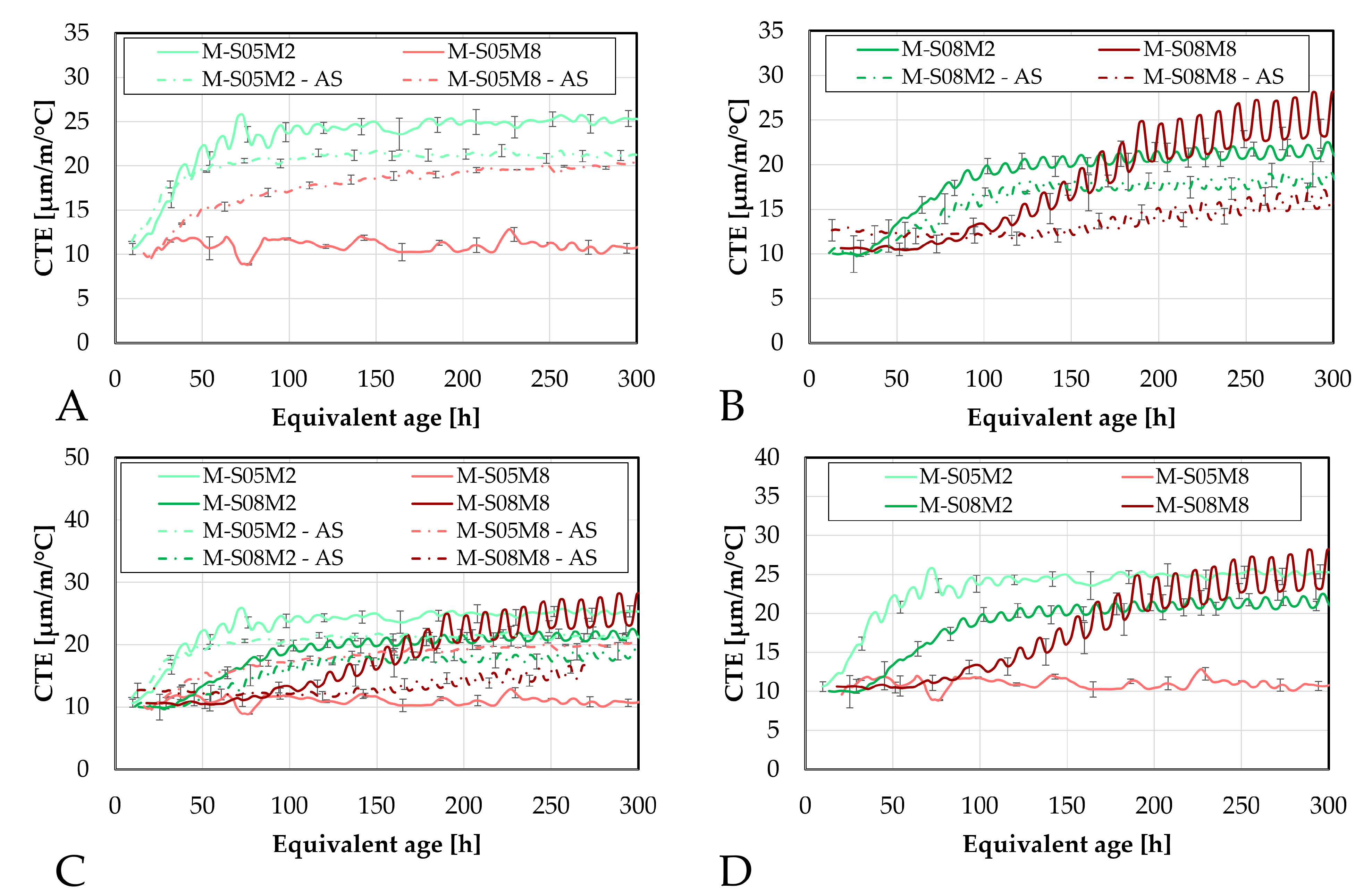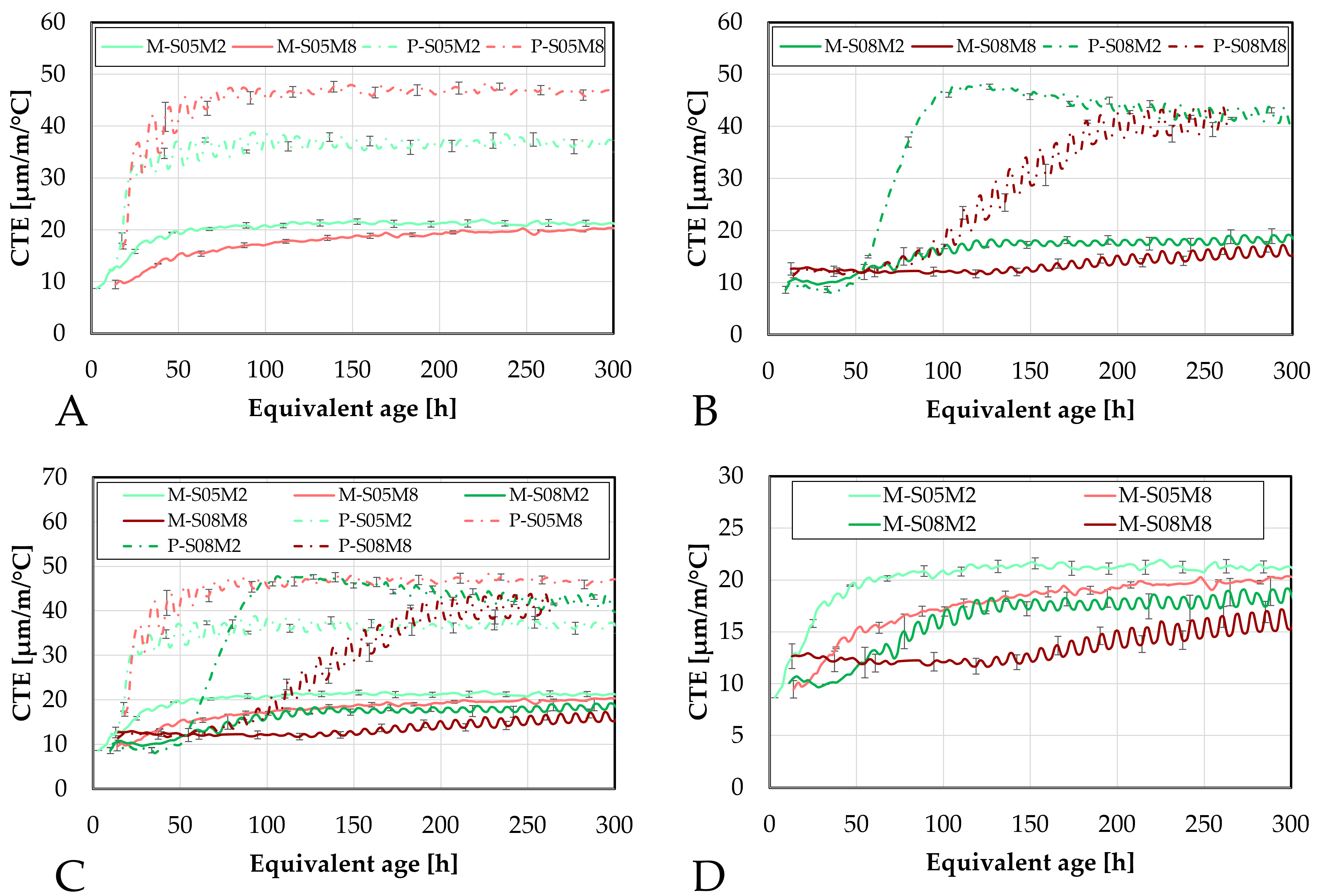 Coefficient of thermal expansion of AAS mortars obtained with the corrugated tubes method, presented as function of the equivalent age: (A). Compositions activated with S/B = 0.5 (compared to the equivalent paste compositions), (B). Compositions activated with S/B = 0.8, (C). Comparison of all mortar and paste compositions, (D). Comparison of the mortar compositions. M = mortar, P = paste.