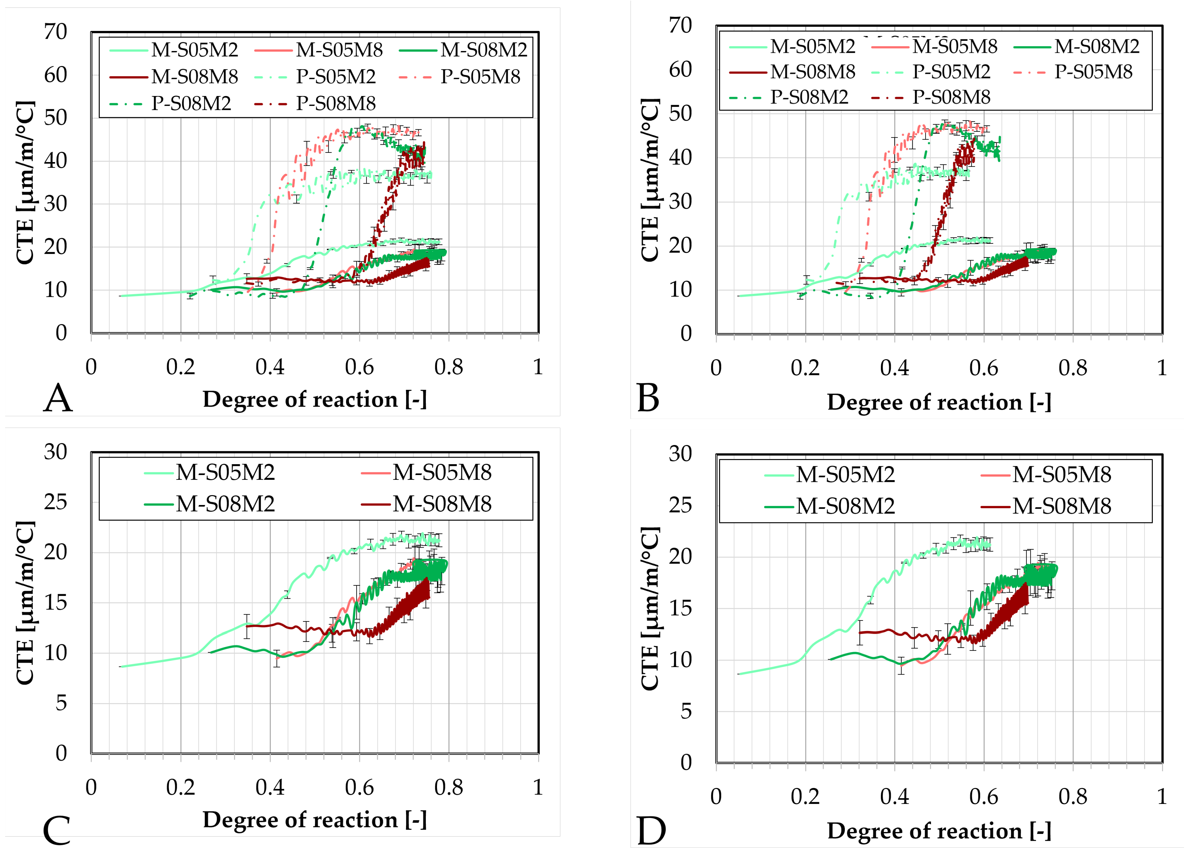 Comparison of the coefficient of thermal expansion obtained with the corrugated tubes method for all AAS mortar compositions as function of the degree of reaction: (A). determined with polynomially fitted ultimate heat compared to paste results, (B). determined with the exponentially fitted ultimate heat compared to the paste results, (C). determined with polynomially fitted ultimate heat, (D). determined with the exponentially fitted ultimate heat. — = mortar results, - · - : paste results.
