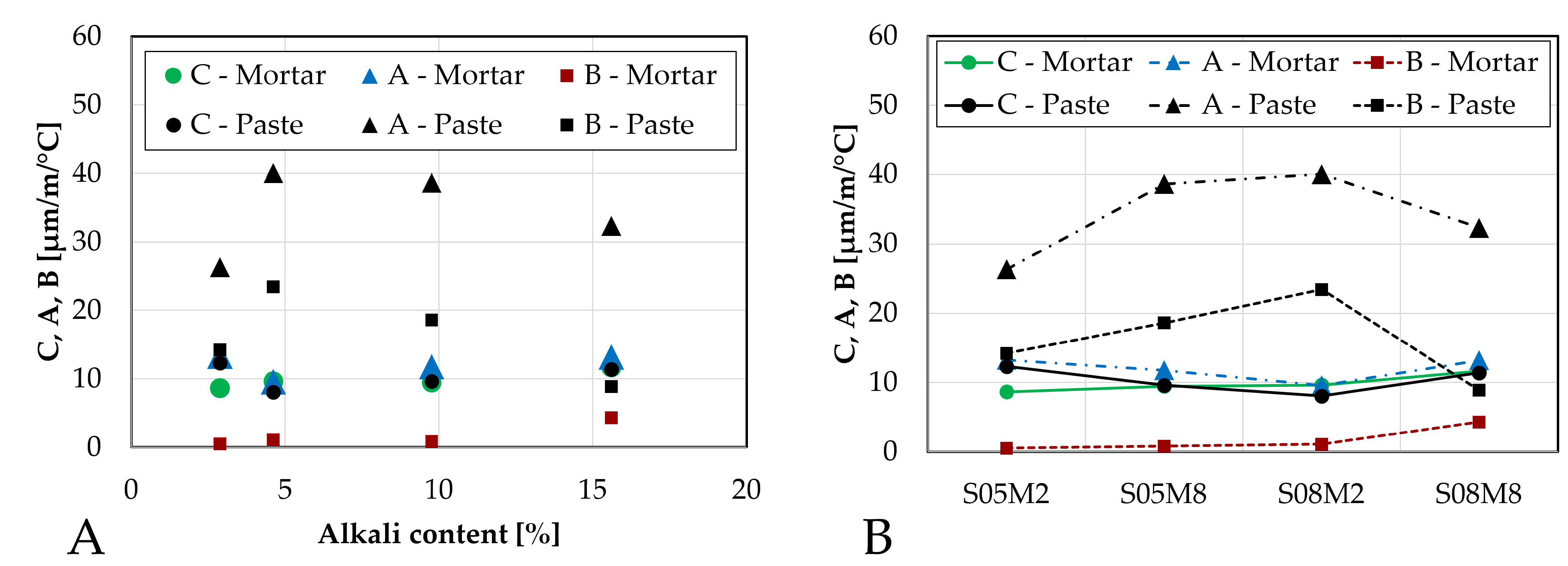 Parameters C, A and B characterizing the CTE of AAS mortars compared to the pastes: (A). as function of the alkali content; (B). as function of the compositions.