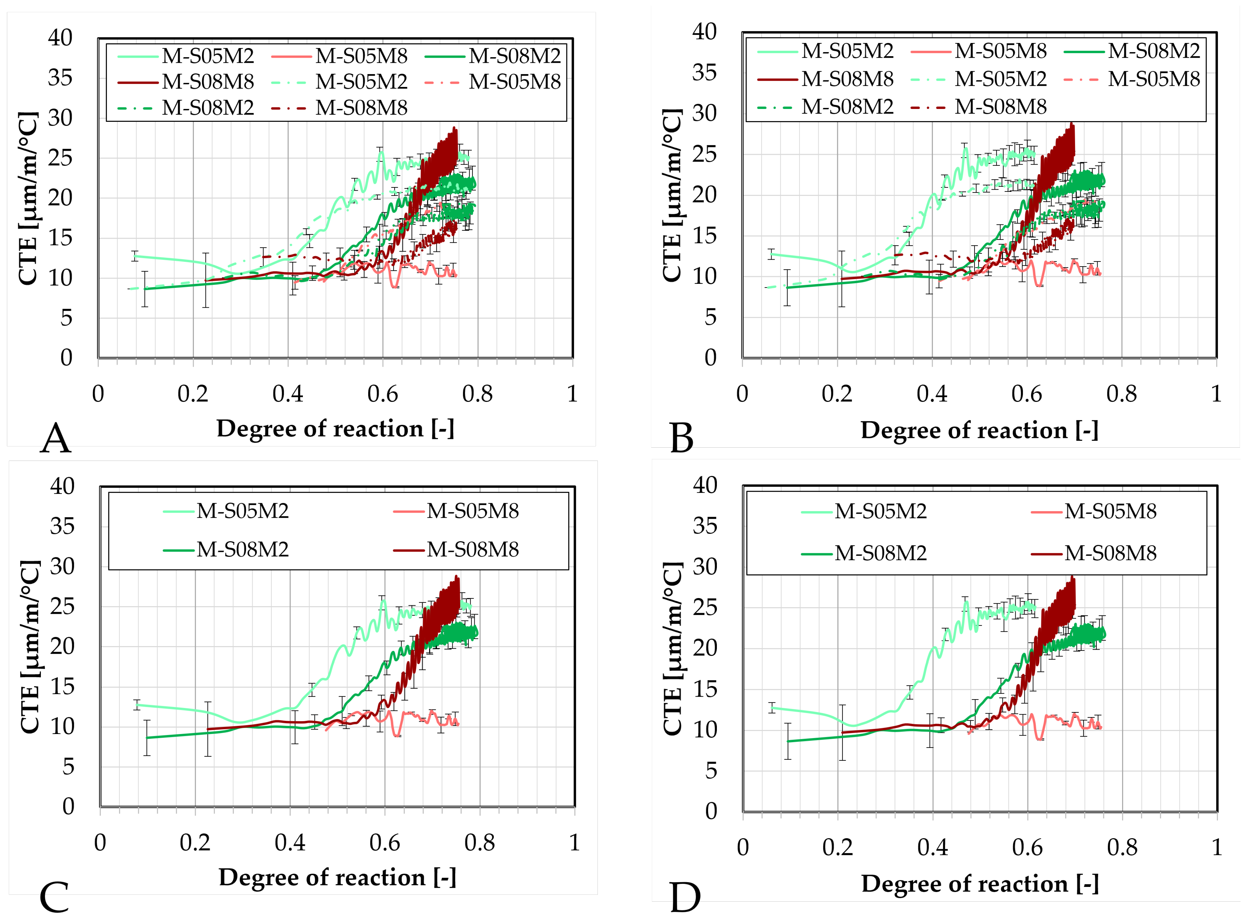 Comparison of the coefficient of thermal expansion obtained with the BTJade method for all AAS mortar compositions as function of the degree of reaction: (A). determined with polynomially fitted ultimate heat compared to the corrugated method, (B). determined with the exponentially fitted ultimate heat compared to the corrugated method, (C). determined with polynomially fitted ultimate heat, (D). determined with the exponentially fitted ultimate heat. (— = BTJade results, - · - = Corrugated tubes method).
