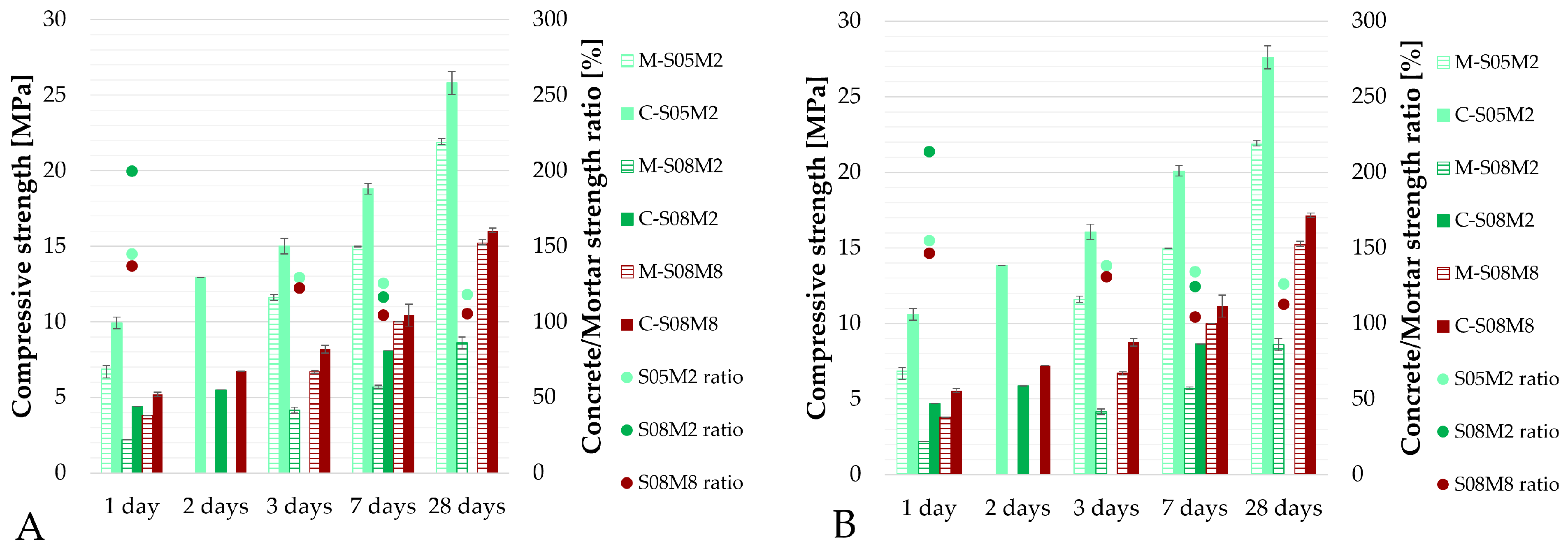 Compressive strength of: (A). AAS concrete cubes (10 × 10 × 10 cm3) compared mortar cubes (5 × 5 × 5 cm3), (B). AAS concrete cubes (equivalent 5 × 5 × 5 cm3) compared mortar cubes (5 × 5 × 5 cm3). Legend: bars: compressive strength, dots: compressive strength ratio between concrete and mortar scale.
