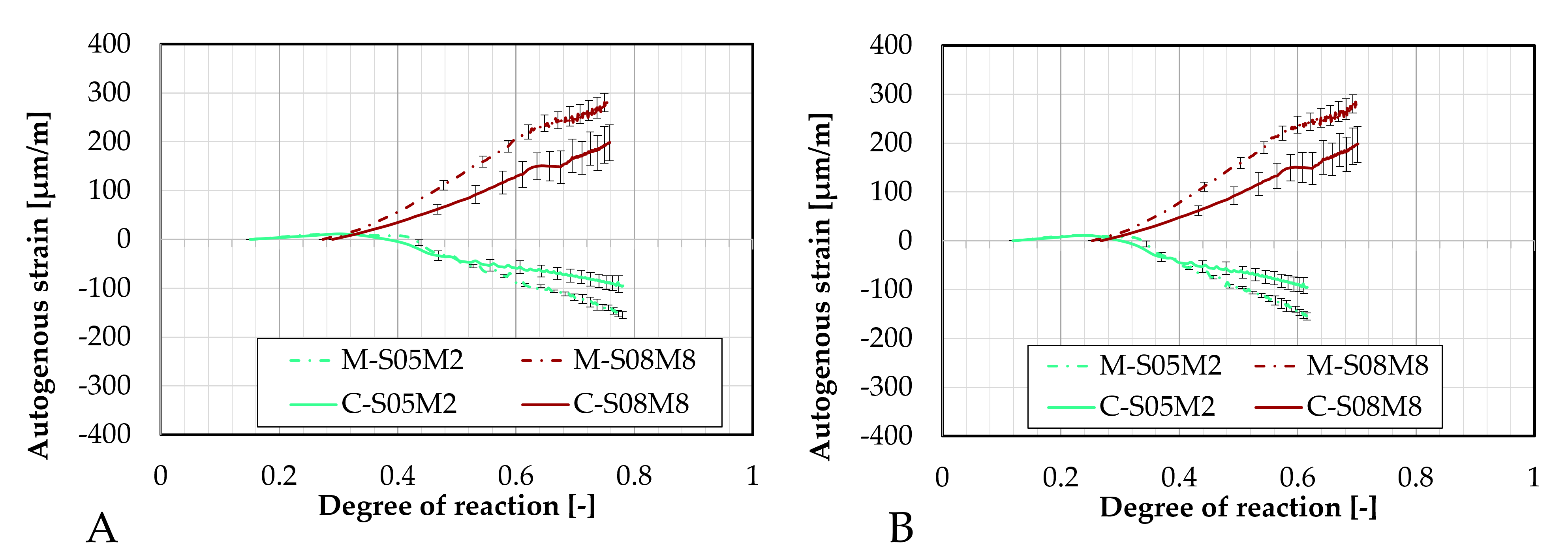 Autogenous strain of AAS concrete compositions compared to mortar compositions, as a function of the degree of reaction computed with the ultimate heat determined by: (A). the polynomial method, (B). the exponential method.