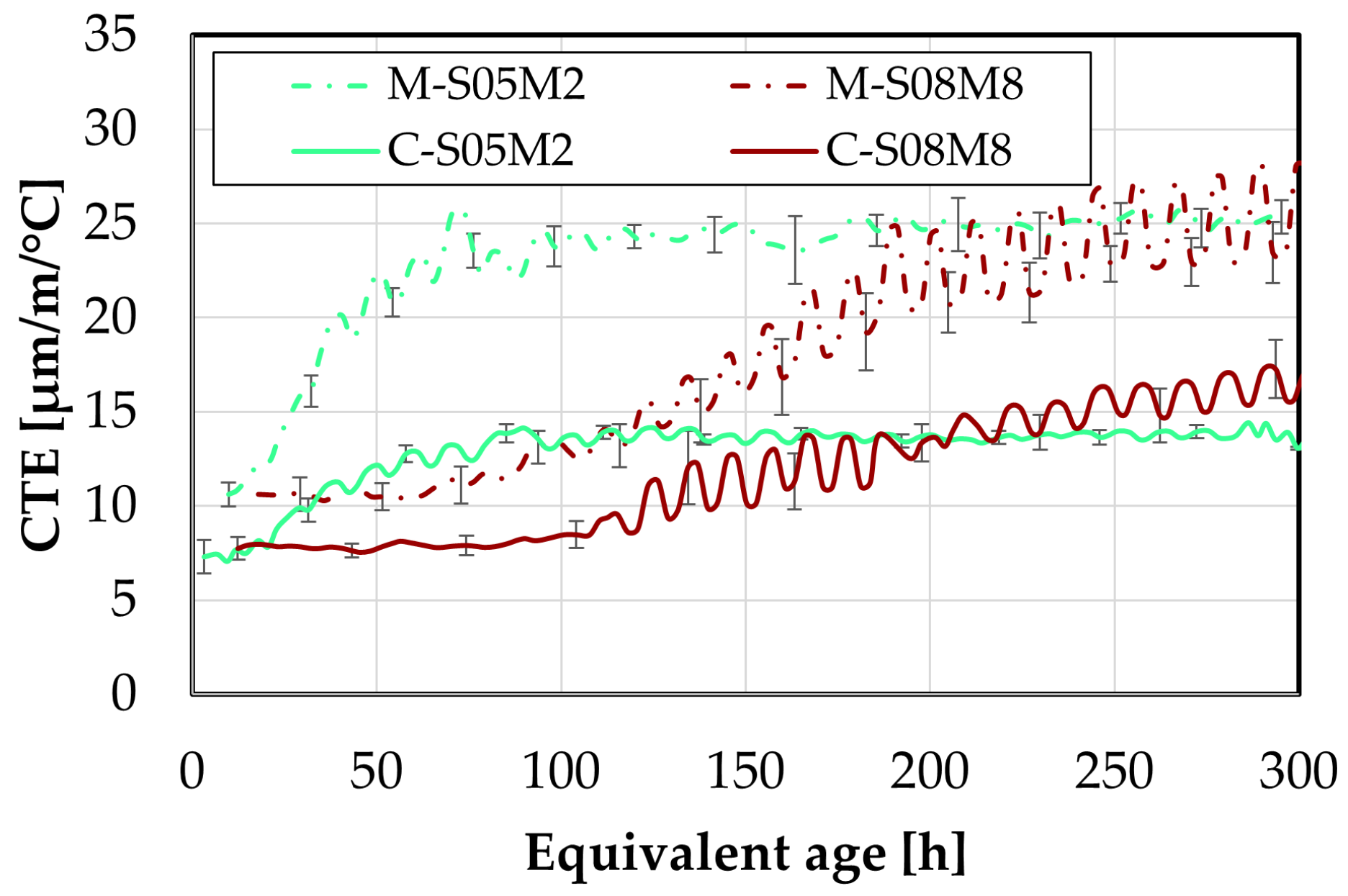 Coefficient of thermal expansion of AAS concrete compositions compared to mortar compositions, as a function of the equivalent age.