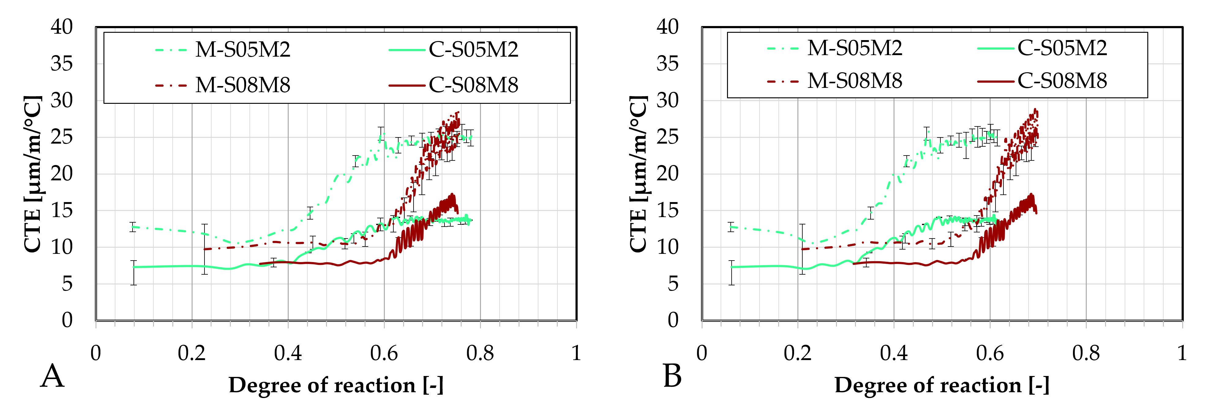 Coefficient of thermal expansion of AAS concrete compositions compared to mortar compositions, as a function of the degree of reaction computed with the ultimate heat determined by: (A). the polynomial method, (B). the exponential method.